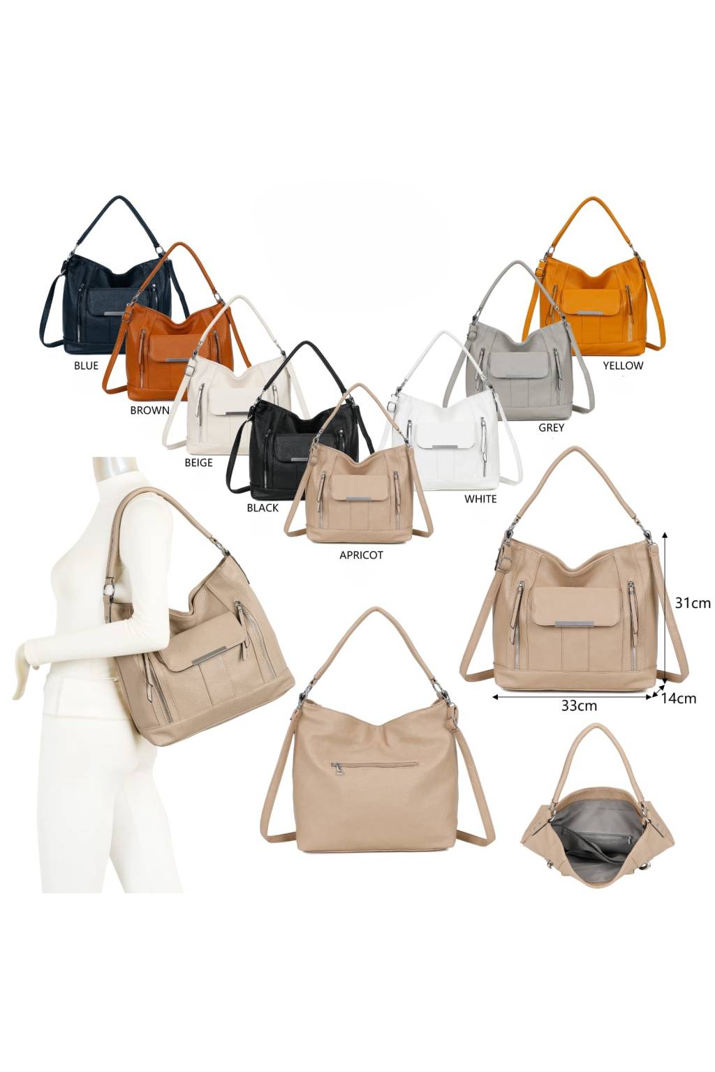 Univerzální městská hobo kabelka na každý den. Měkké tělo z kvalitní eko kůže, pohodlné horní ucho a odepínací nastavitelný popruh pro nošení do ruky, na rameni i crossbody. Přední designové zipy a kapsa s klopou dodají šmrnc a nabídnou rychlý přístup k drobnostem.