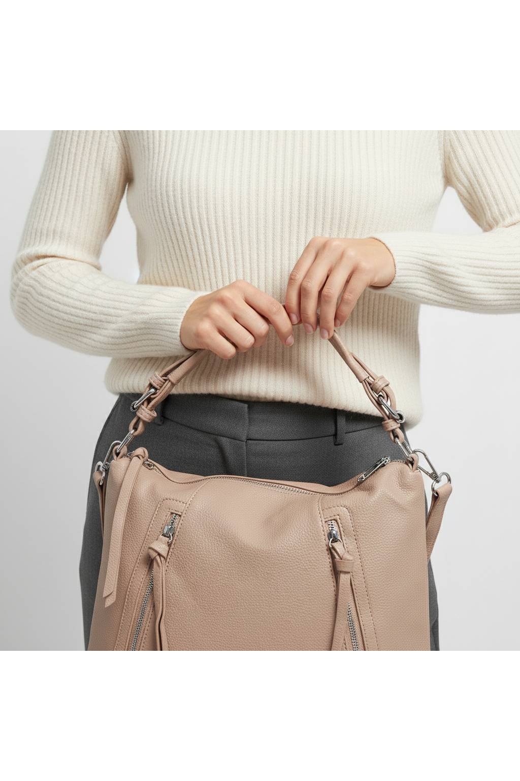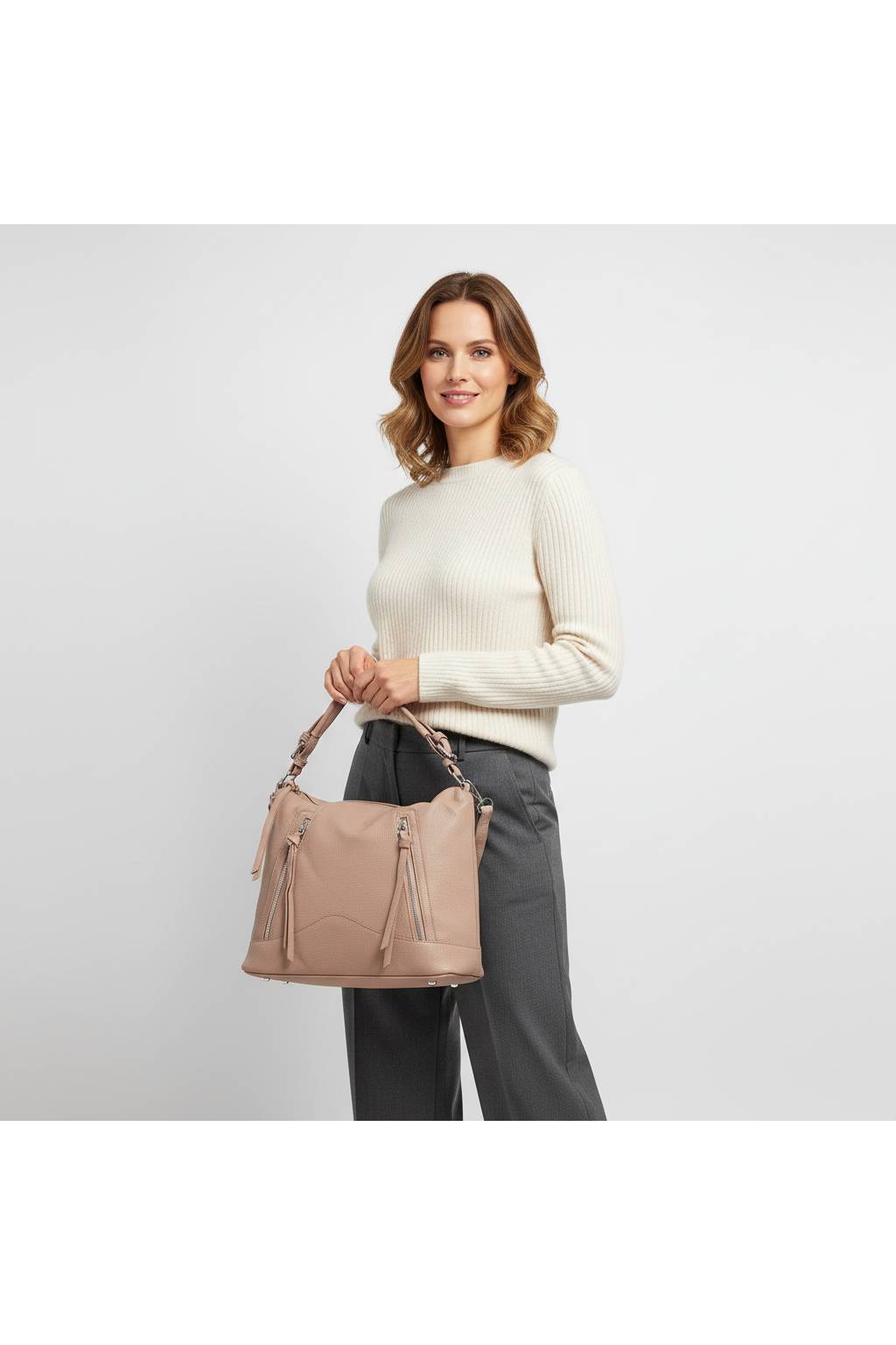 Univerzální městská kabelka se siluetou hobo je stvořená na každý den. Díky pohodlnému hornímu uchu a odnímatelnému nastavitelnému popruhu ji lze nosit v ruce, na rameni i crossbody. Přední designové zipy dodají šmrnc a zároveň skrývají rychlá kapsy na drobnosti.