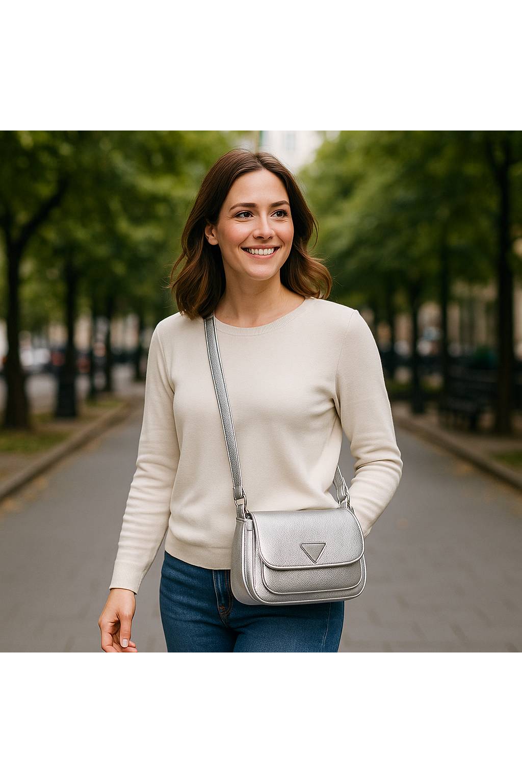 Nastavitelný ramenní popruh umožňuje pohodlné nošení jak přes rameno, tak i křížem přes tělo. Moderní design s decentním kovovým detailem na přední klopě dělá z této kabelky univerzální kousek vhodný do práce, na nákupy, cestování i setkání s přáteli.