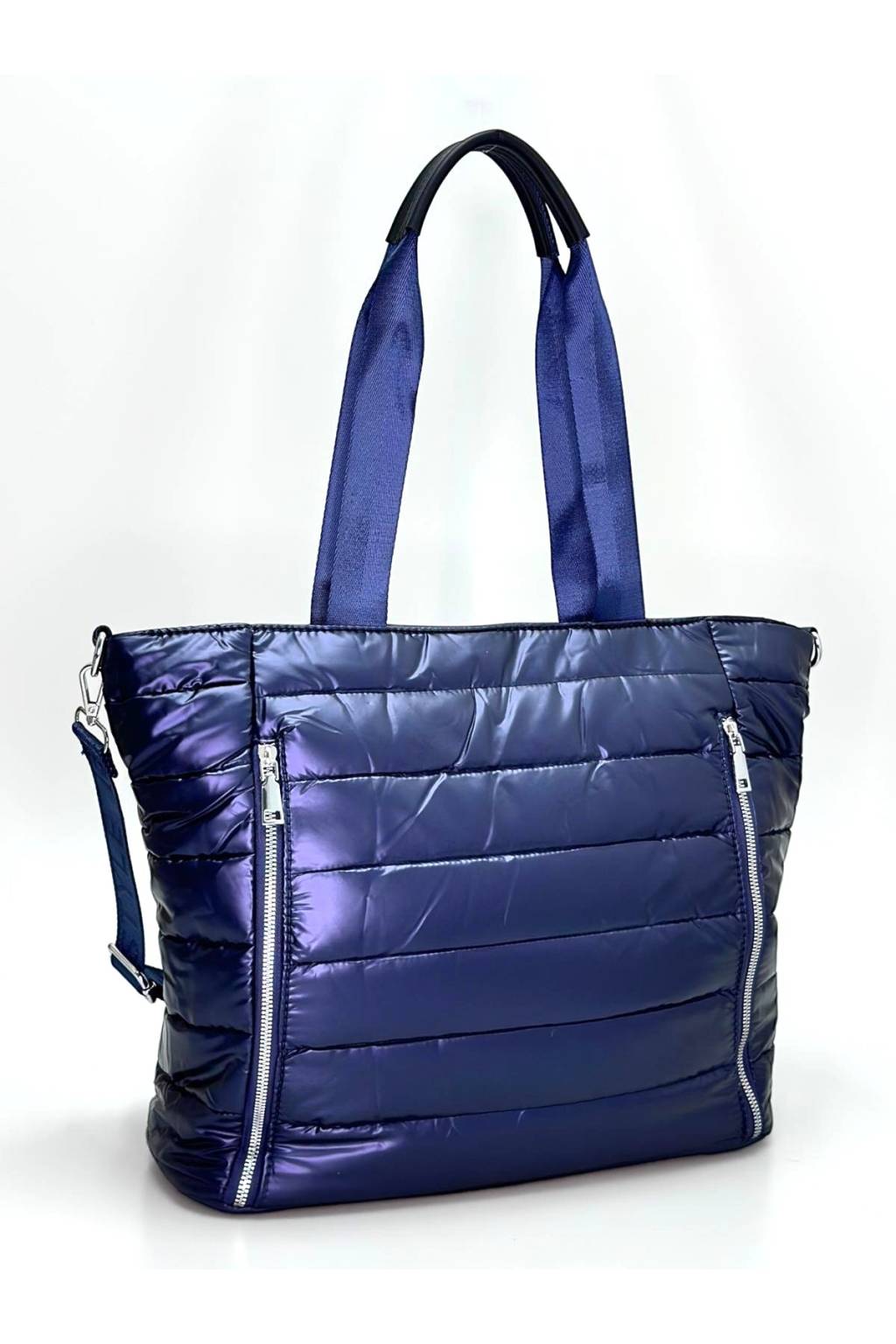 Trendy dámská shopper kabelka z lehkého, mírně lesklého a vodoodpudivého prošívaného materiálu. Praktické zapínání na zip, dlouhá ucha na rameno a odnímatelný nastavitelný crossbody popruh z ní dělají ideální tašku do města, do práce i na víkend. Interiér je chytře členěný, takže mobil, klíče i peněženku máte vždy po ruce.