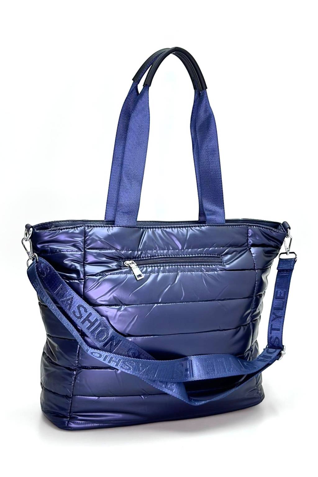 Trendy dámská shopper kabelka z lehkého, mírně lesklého a vodoodpudivého prošívaného materiálu. Praktické zapínání na zip, dlouhá ucha na rameno a odnímatelný nastavitelný crossbody popruh z ní dělají ideální tašku do města, do práce i na víkend. Interiér je chytře členěný, takže mobil, klíče i peněženku máte vždy po ruce.