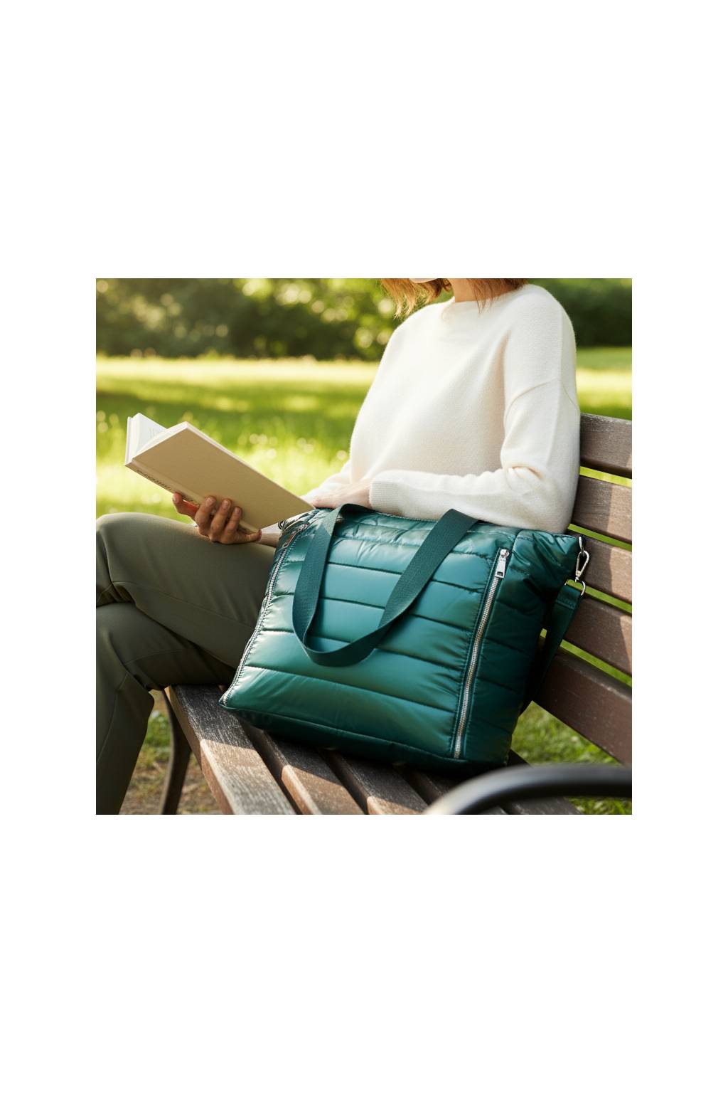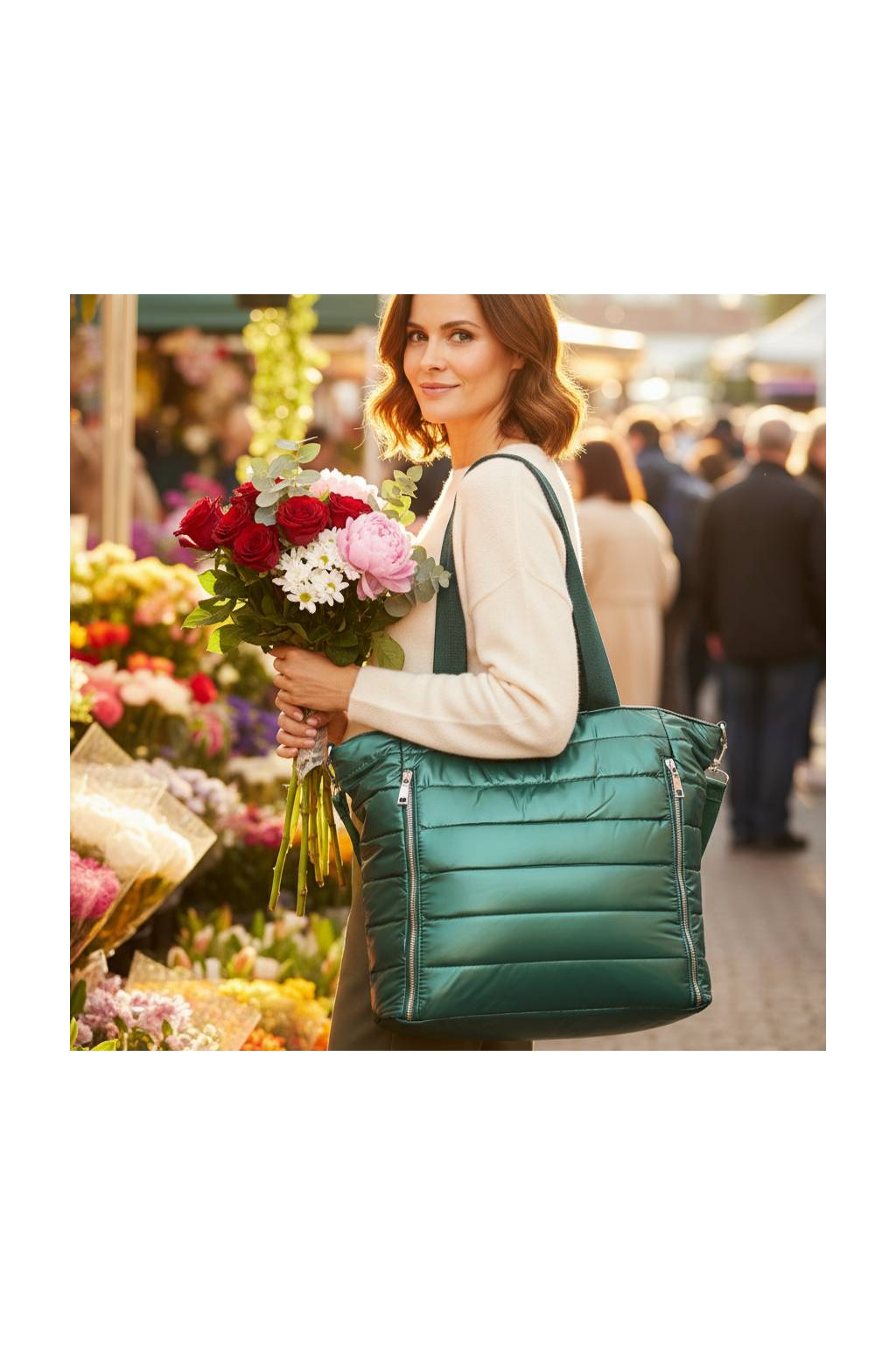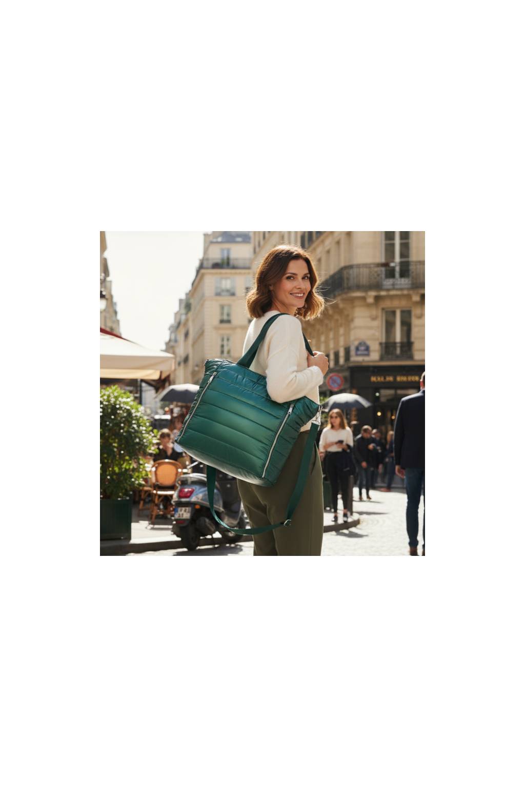 Trendy dámská shopper kabelka z lehkého, mírně lesklého a vodoodpudivého prošívaného materiálu. Praktické zapínání na zip, dlouhá ucha na rameno a odnímatelný nastavitelný crossbody popruh z ní dělají ideální tašku do města, do práce i na víkend. Interiér je chytře členěný, takže mobil, klíče i peněženku máte vždy po ruce.