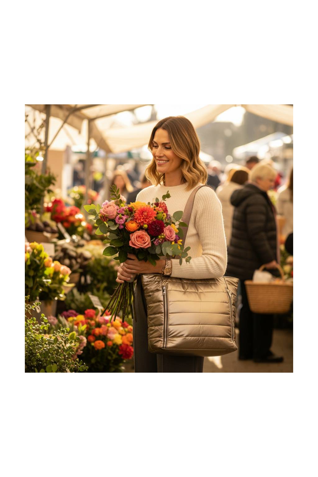 Popruhy: dlouhá pevná ucha + odnímatelný/nastavitelný crossbody popruh (kovové karabiny).
