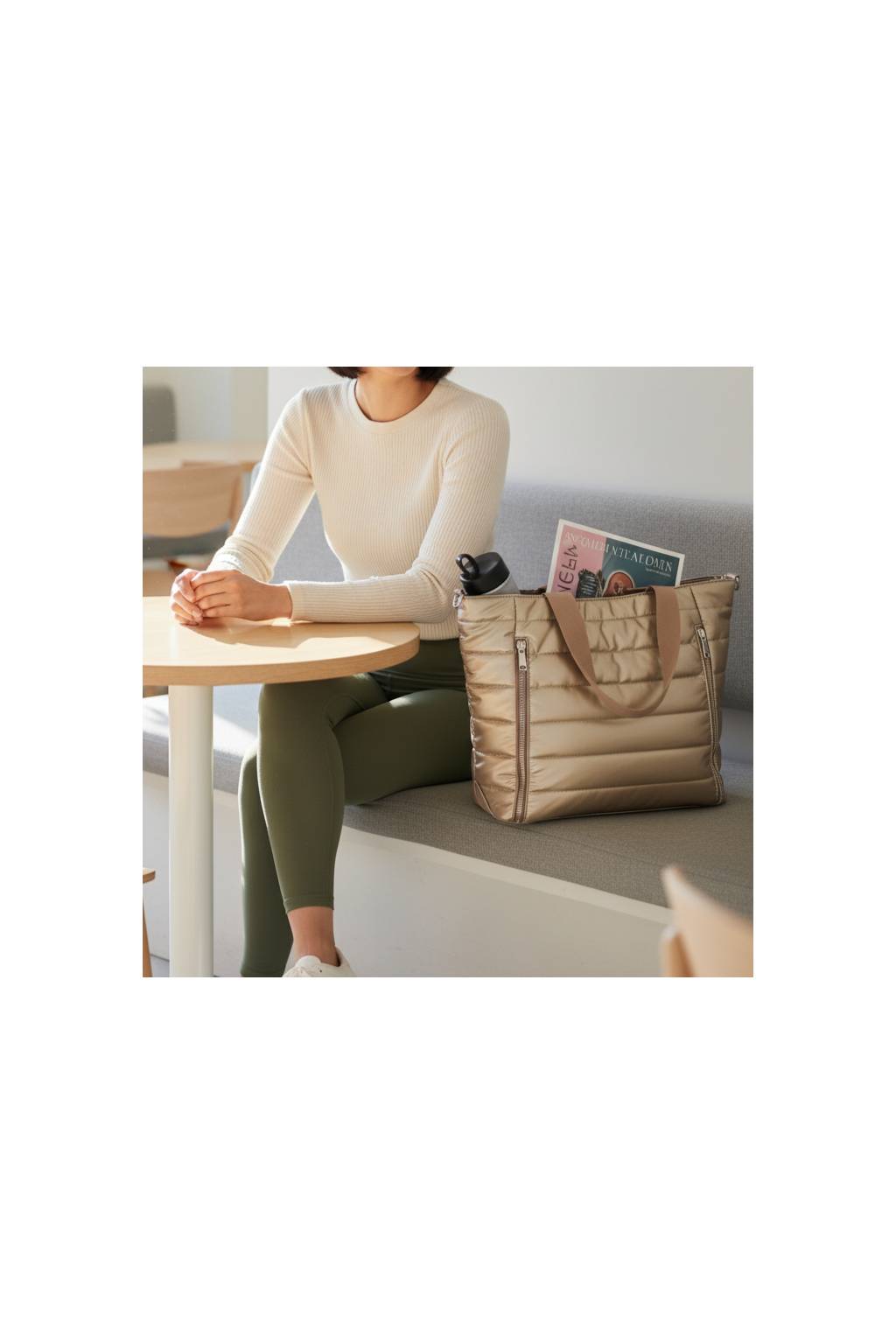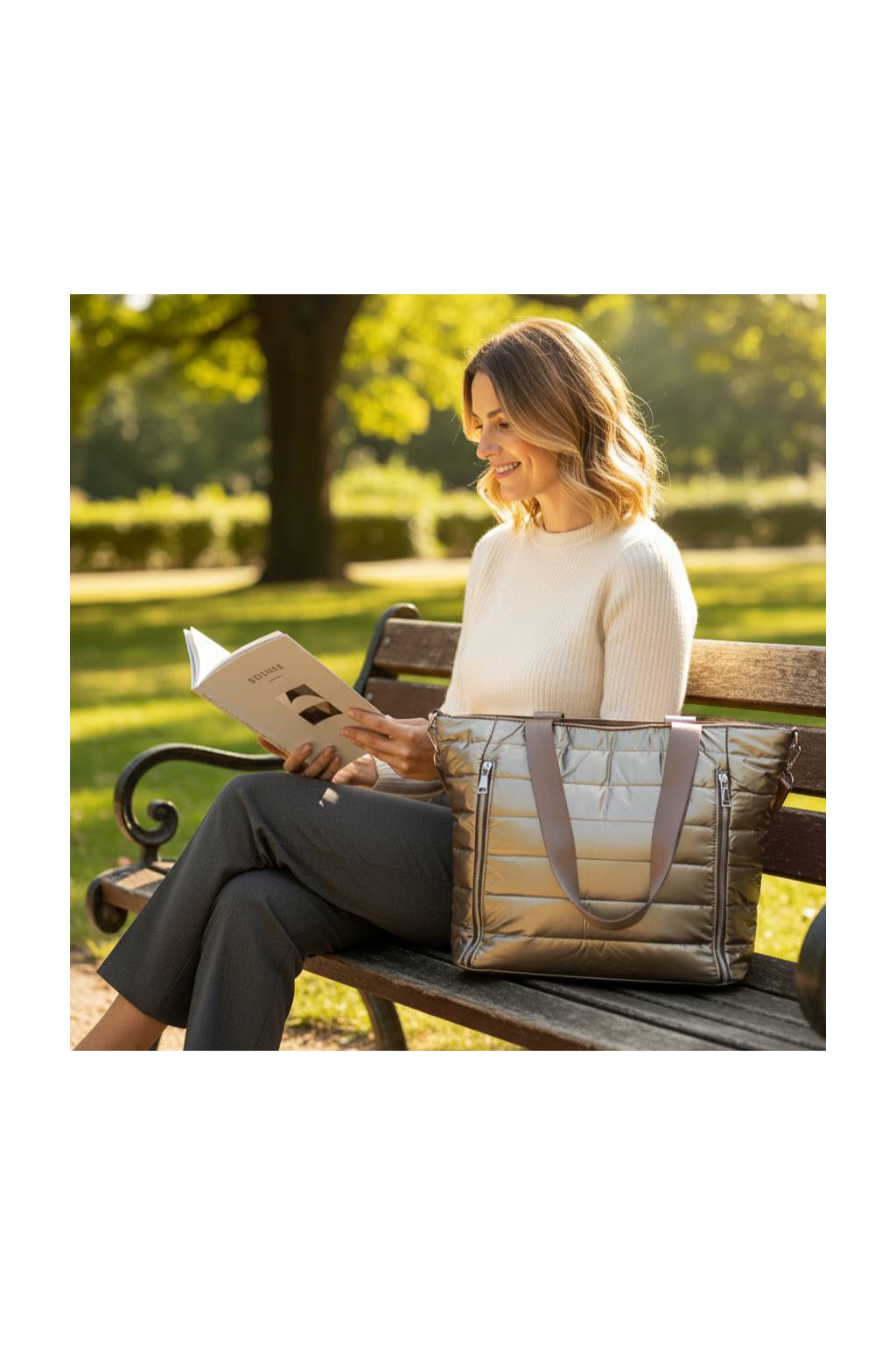 Trendy dámská shopper kabelka z lehkého, mírně lesklého a vodoodpudivého prošívaného materiálu. Praktické zapínání na zip, dlouhá ucha na rameno a odnímatelný nastavitelný crossbody popruh z ní dělají ideální tašku do města, do práce i na víkend. Interiér je chytře členěný, takže mobil, klíče i peněženku máte vždy po ruce.