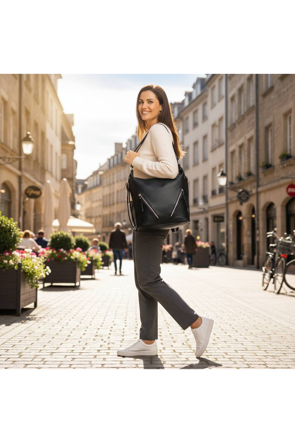 Pořádek uvnitř: hlavní komora na zip, středová zip kapsa, boční přihrádky na telefon a klíče, zadní vnější kapsa pro rychlý přístup.