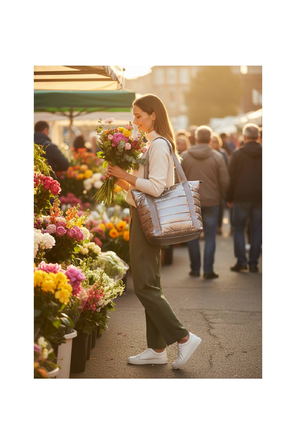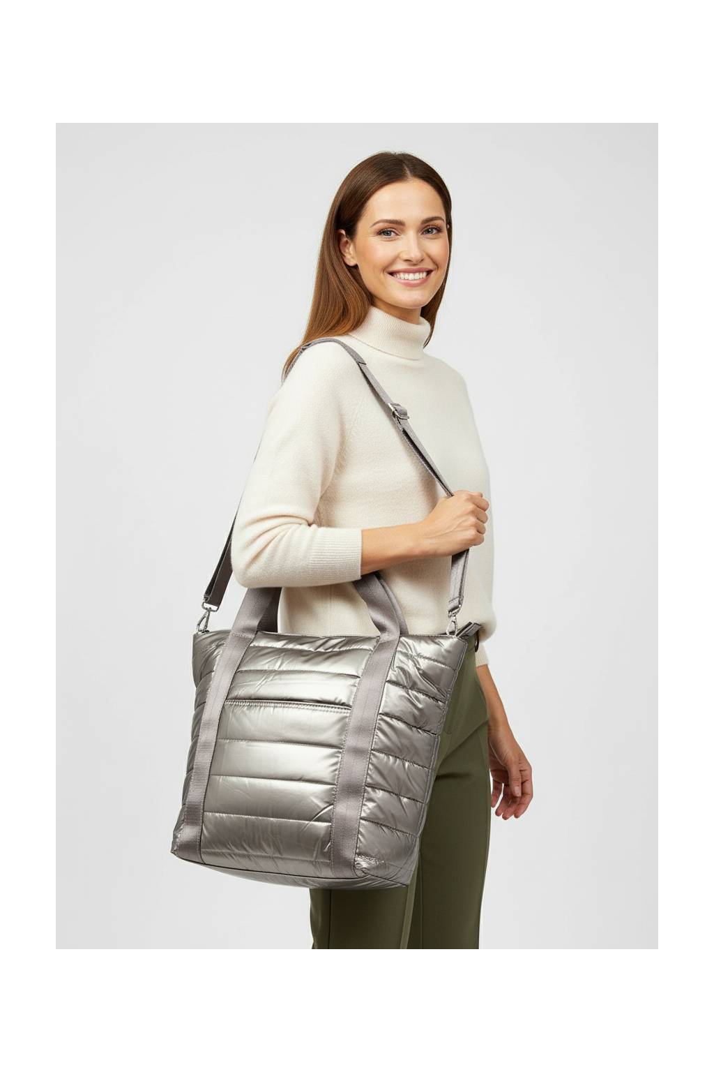 Moderní shopper kabelka v oblíbeném „puffer“ designu kombinuje styl, pohodlí a velký objem. Díky odnímatelnému, délkově nastavitelnému popruhu ji snadno proměníte z elegantní tašky na rameno na praktickou crossbody. Lesklý metalický povrch dodá outfitu šmrnc a zároveň je lehoučký a mírně vodoodpudivý – ideální do města, do práce i na víkend.