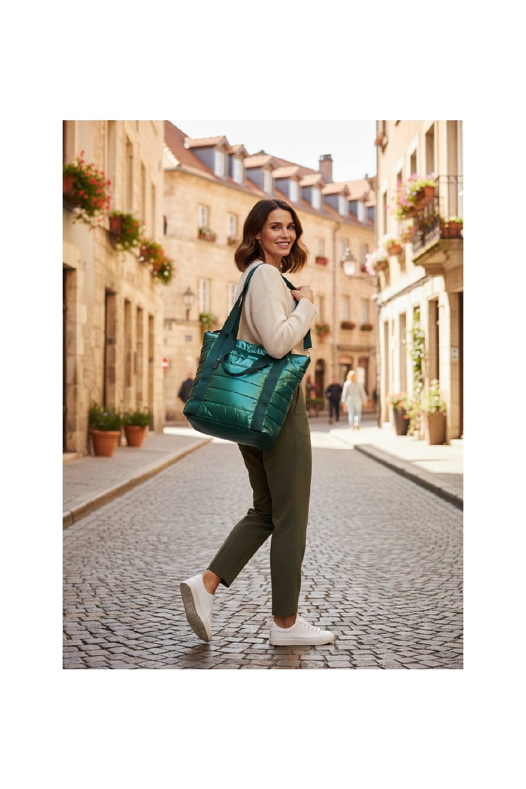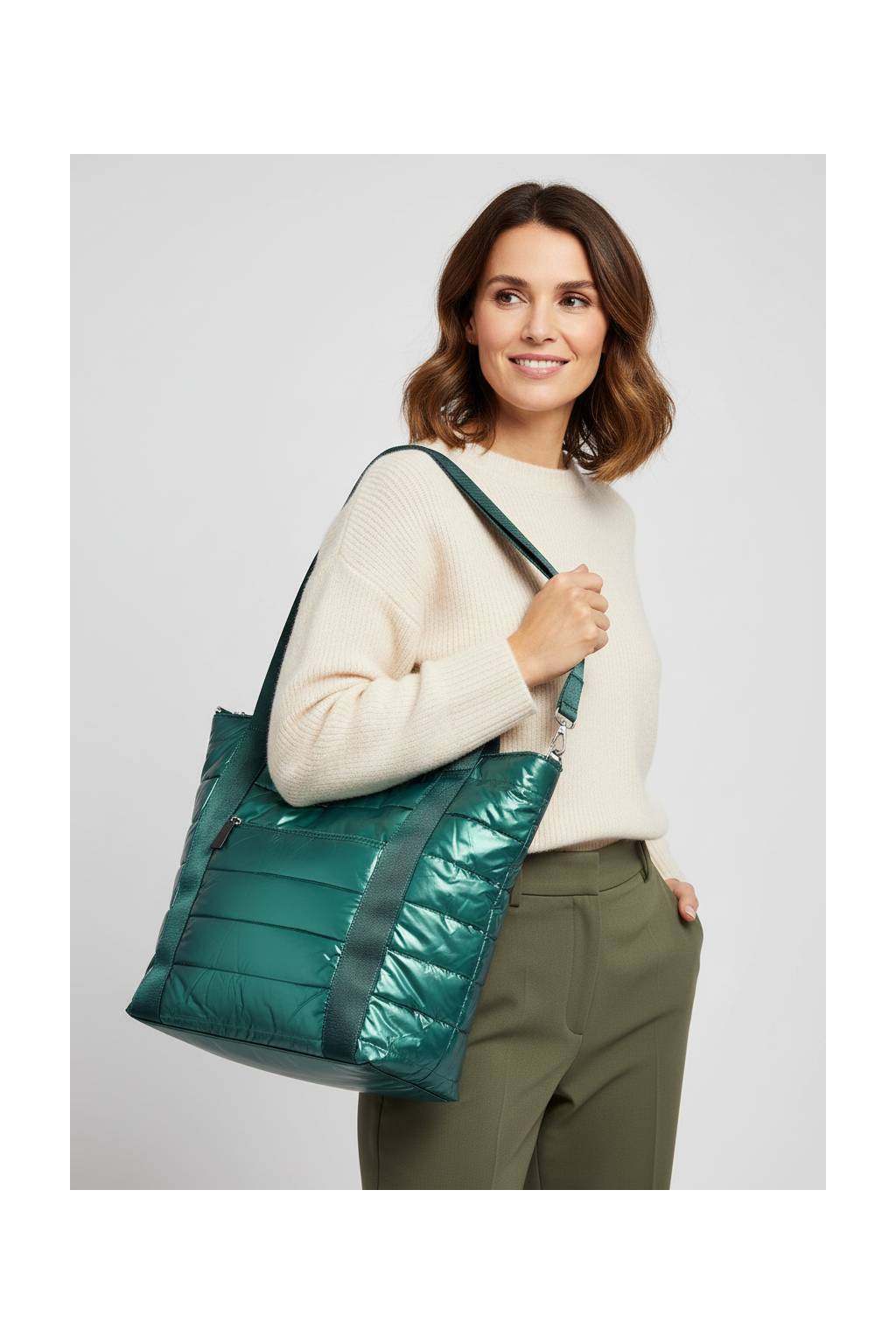 Moderní shopper kabelka v oblíbeném „puffer“ designu kombinuje styl, pohodlí a velký objem. Díky odnímatelnému, délkově nastavitelnému popruhu ji snadno proměníte z elegantní tašky na rameno na praktickou crossbody. Lesklý metalický povrch dodá outfitu šmrnc a zároveň je lehoučký a mírně vodoodpudivý – ideální do města, do práce i na víkend.