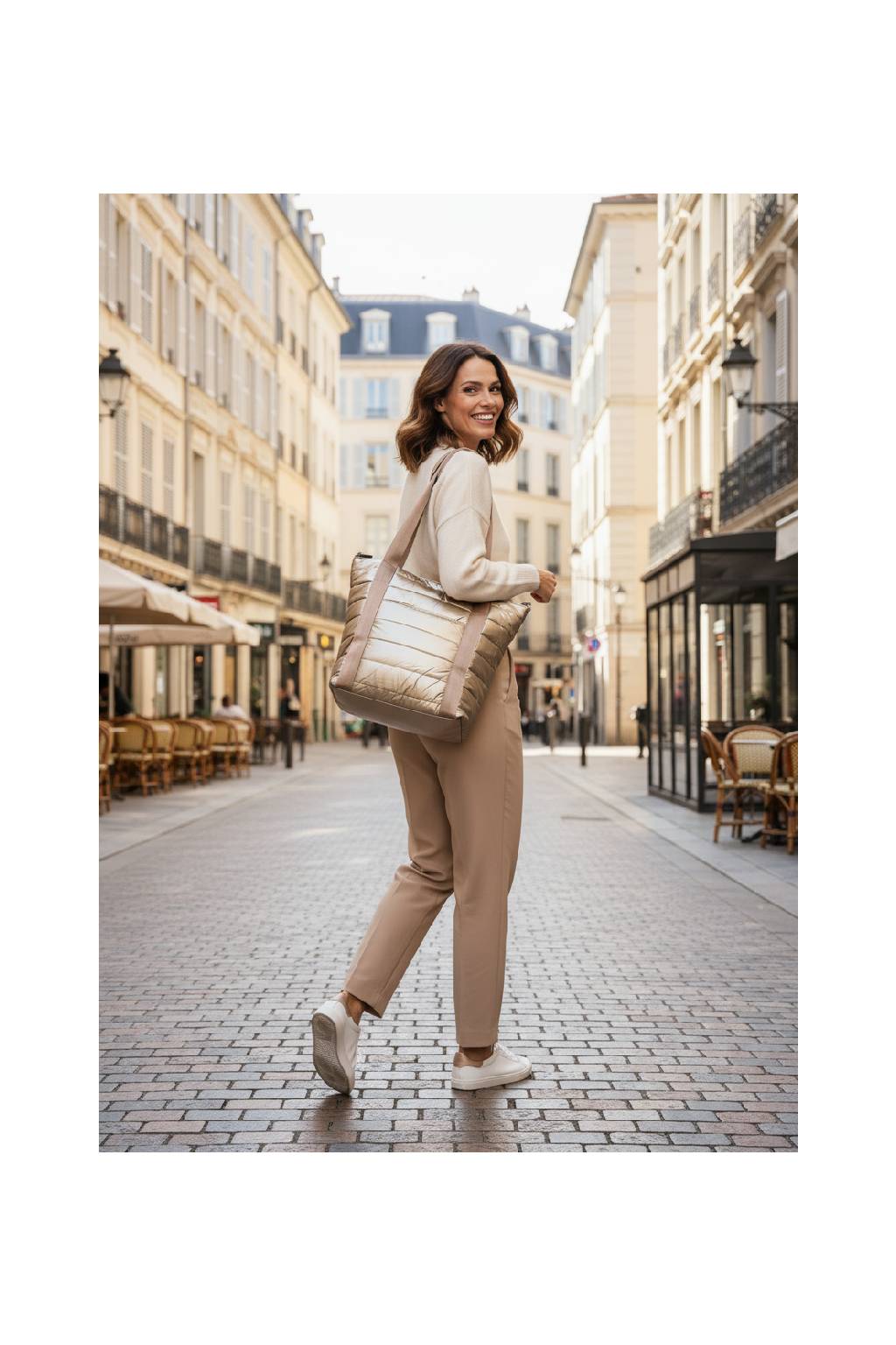 Proč si ji zamilujete: spojuje luxusní zlatý vzhled s praktičností sportovní tašky. Skvěle ladí se sakem, kabátem i s péřovkou – zkrátka univerzální kousek na každý den.