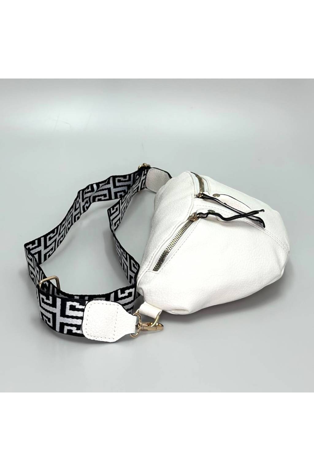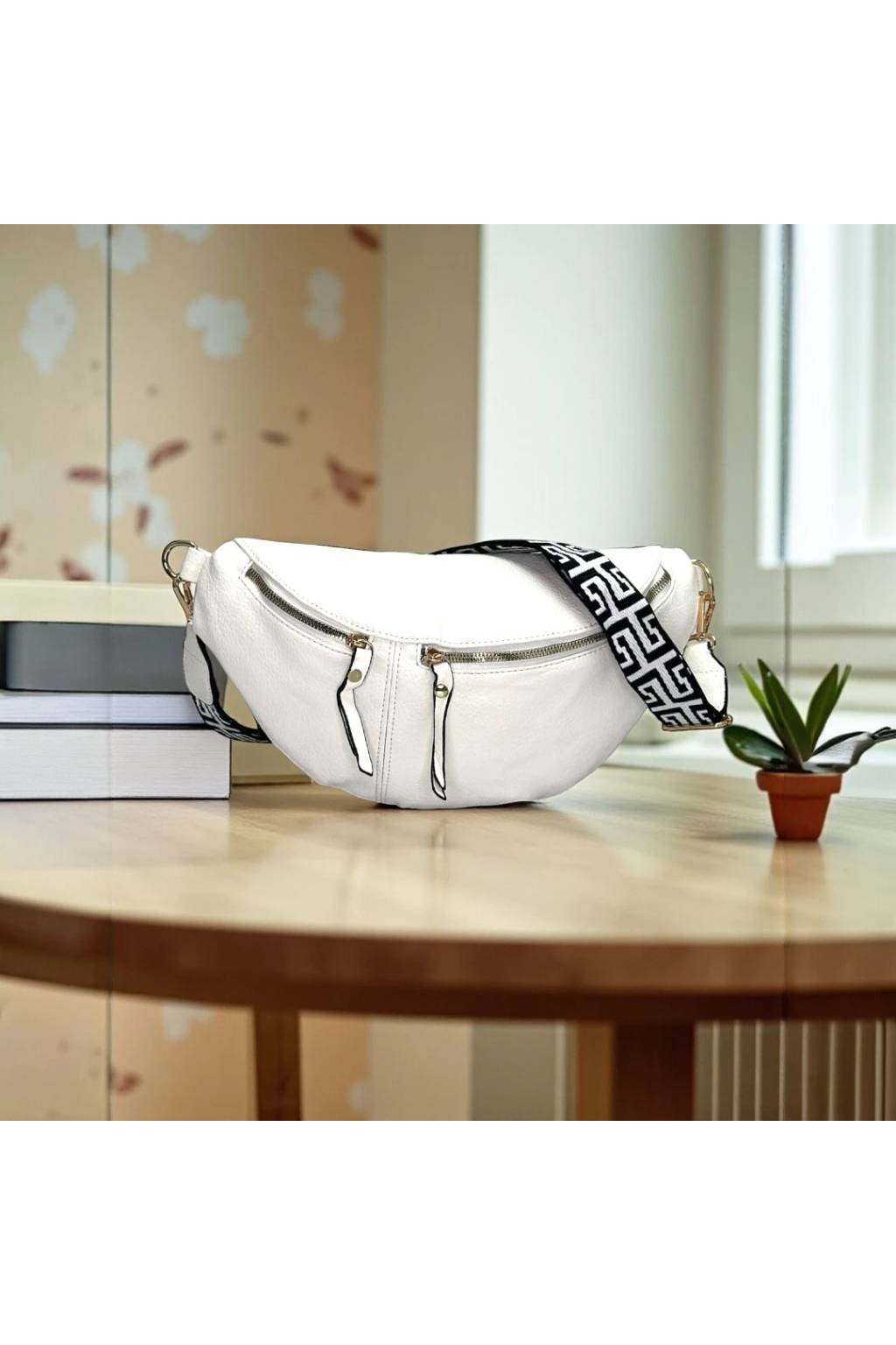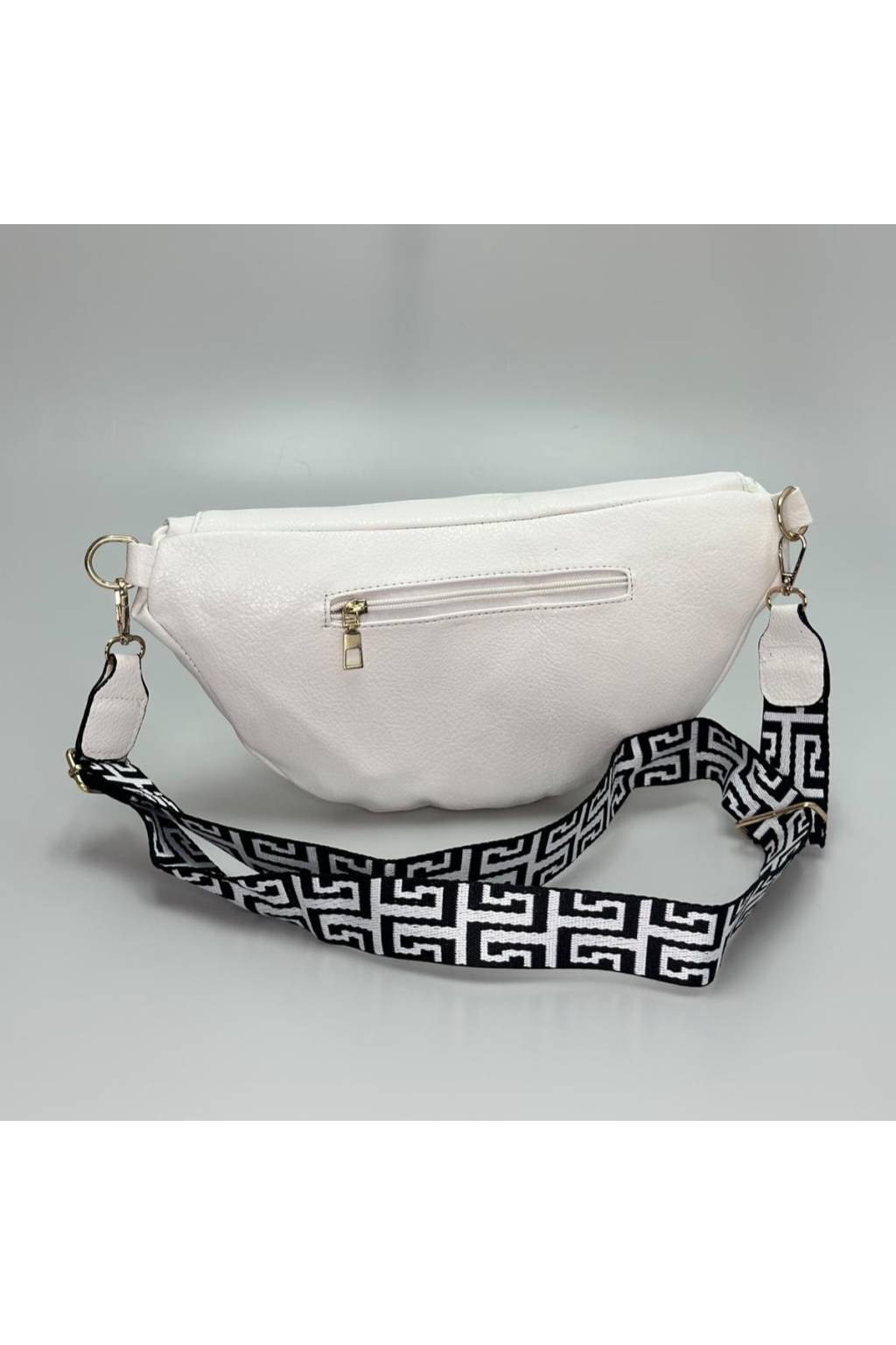 Ledvinka disponuje dvěma předními kapsami na zip, které zajišťují pohodlný přístup k drobnostem, jako jsou klíče, telefon či kosmetika. Hlavní prostor je dostatečně prostorný a bezpečně uzavíratelný zipem. Velkou předností je široký nastavitelný popruh s černo-bílým geometrickým vzorem, který dodává kabelce trendy vzhled a zároveň poskytuje komfort při nošení.