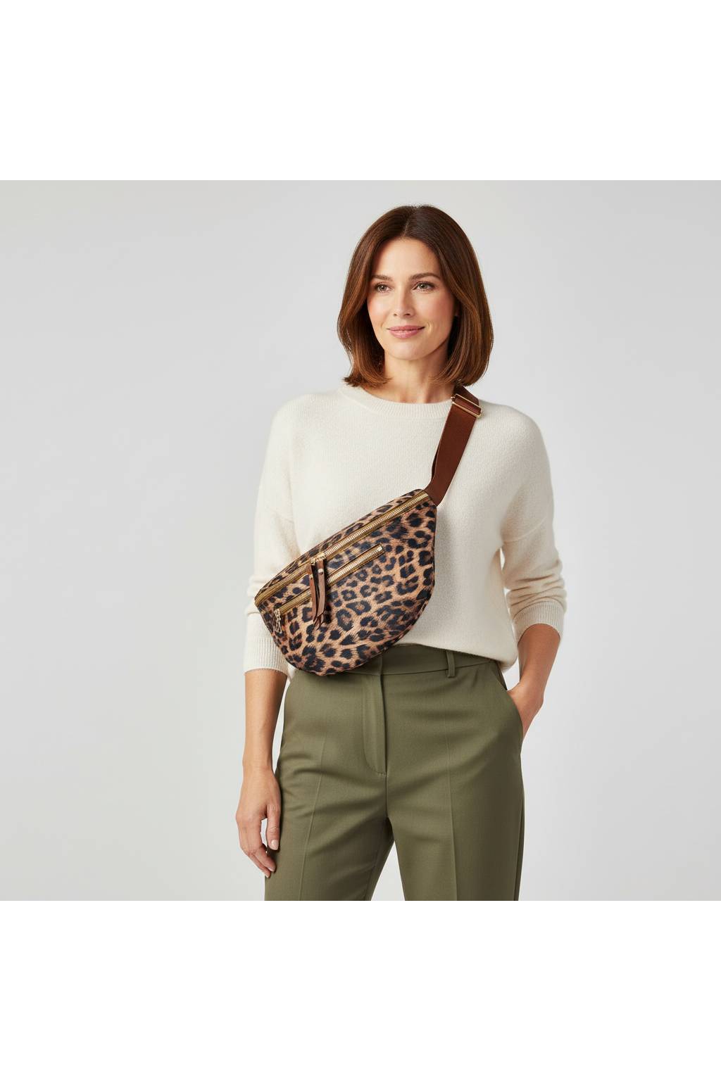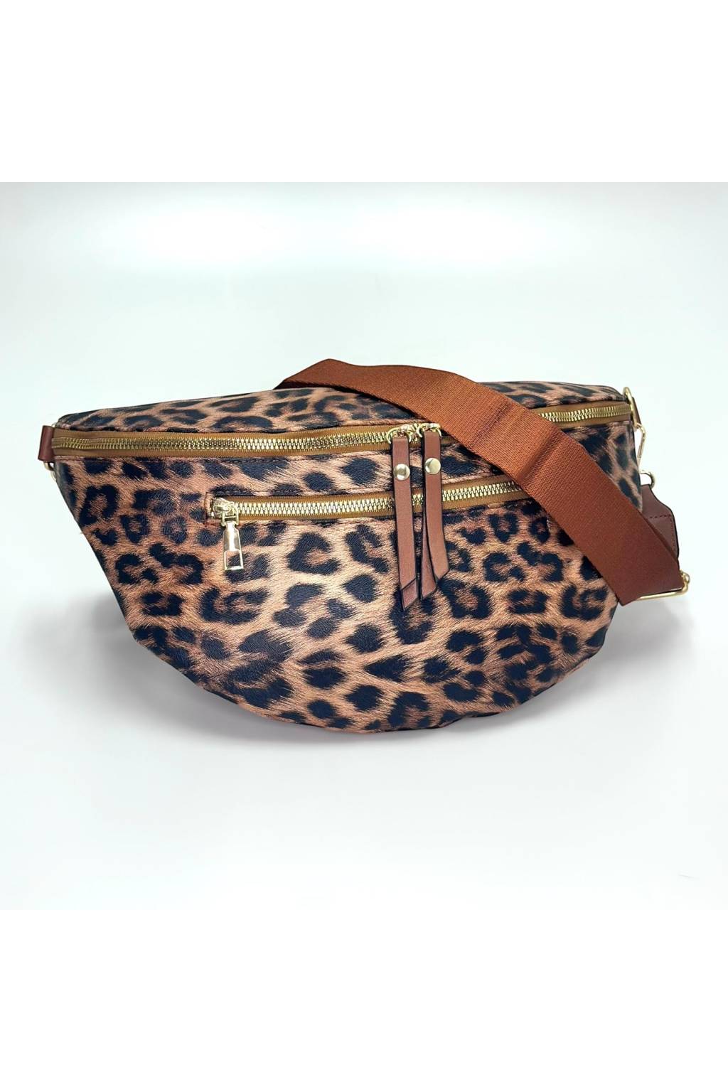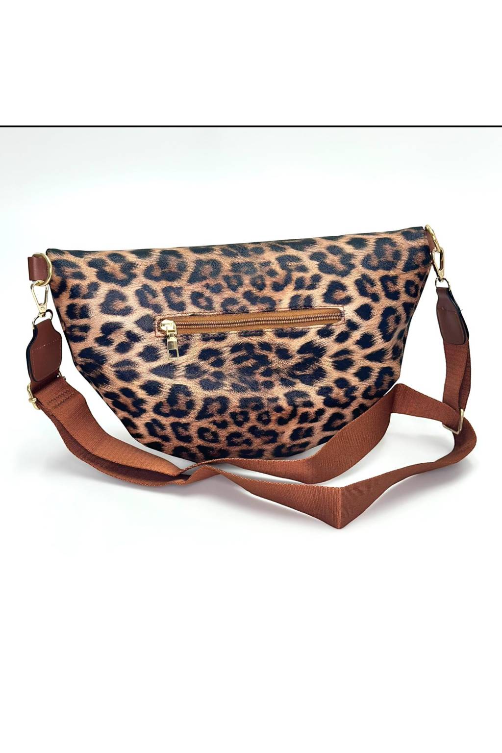 Elegantní polokruhová crossbody kabelka s výrazným leopardím potiskem a širokým pohodlným popruhem. Lehká, praktická a nepřehlédnutelná – ideální do města, na víkend i na cestování.