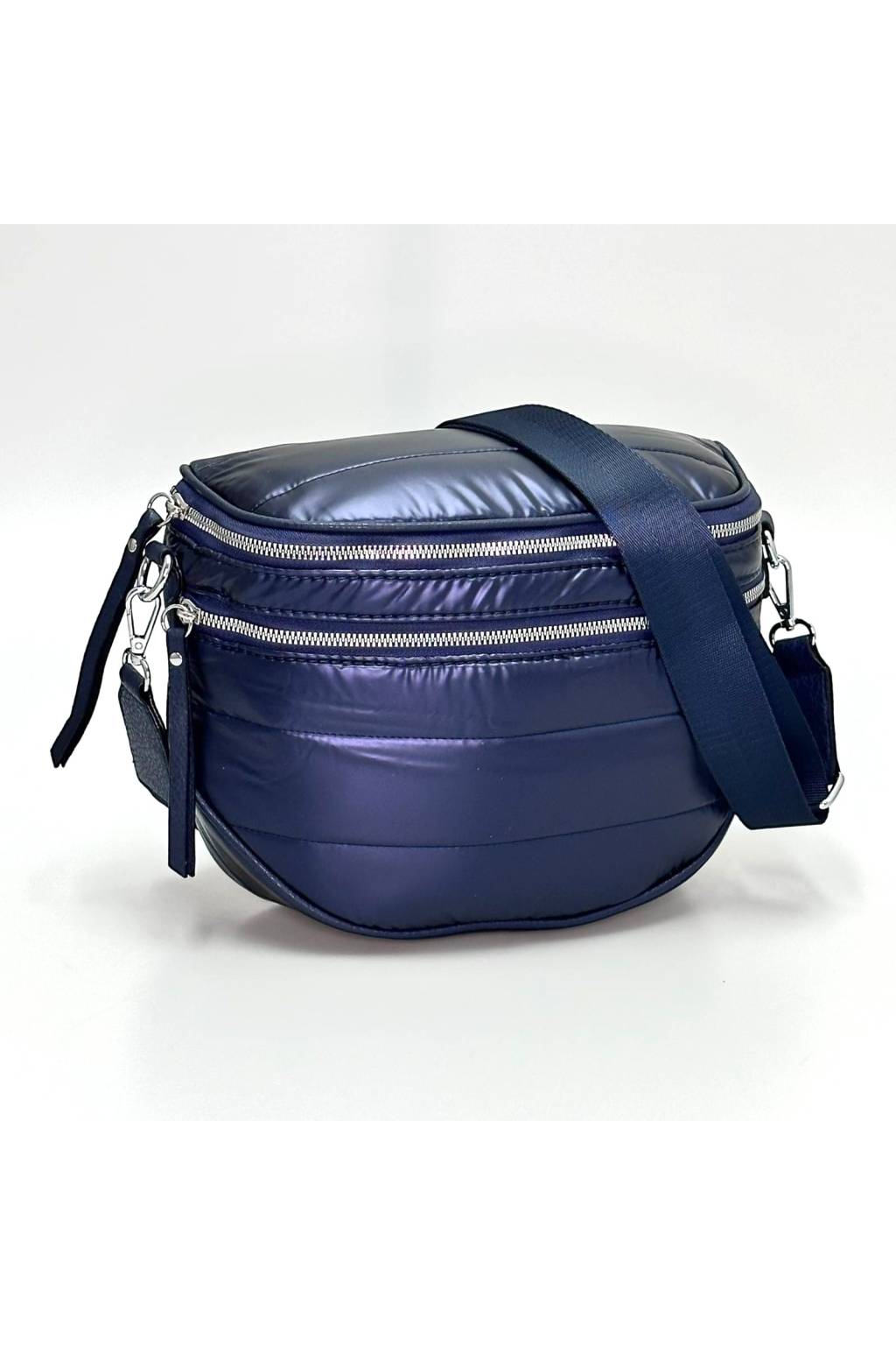 Moderní dámská kabelka v tmavě modré barvě spojuje styl a funkčnost. Puffer prošívání přidává trendový vzhled, zatímco více zipových přihrádek udrží vše přehledně rozdělené. Uvnitř najdete organizovaný prostor pro denní nezbytnosti – od peněženky a diáře až po kosmetiku. Popruh snadno nastavíte; kabelku tak během chvilky změníte z ramenní tašky na crossbody.