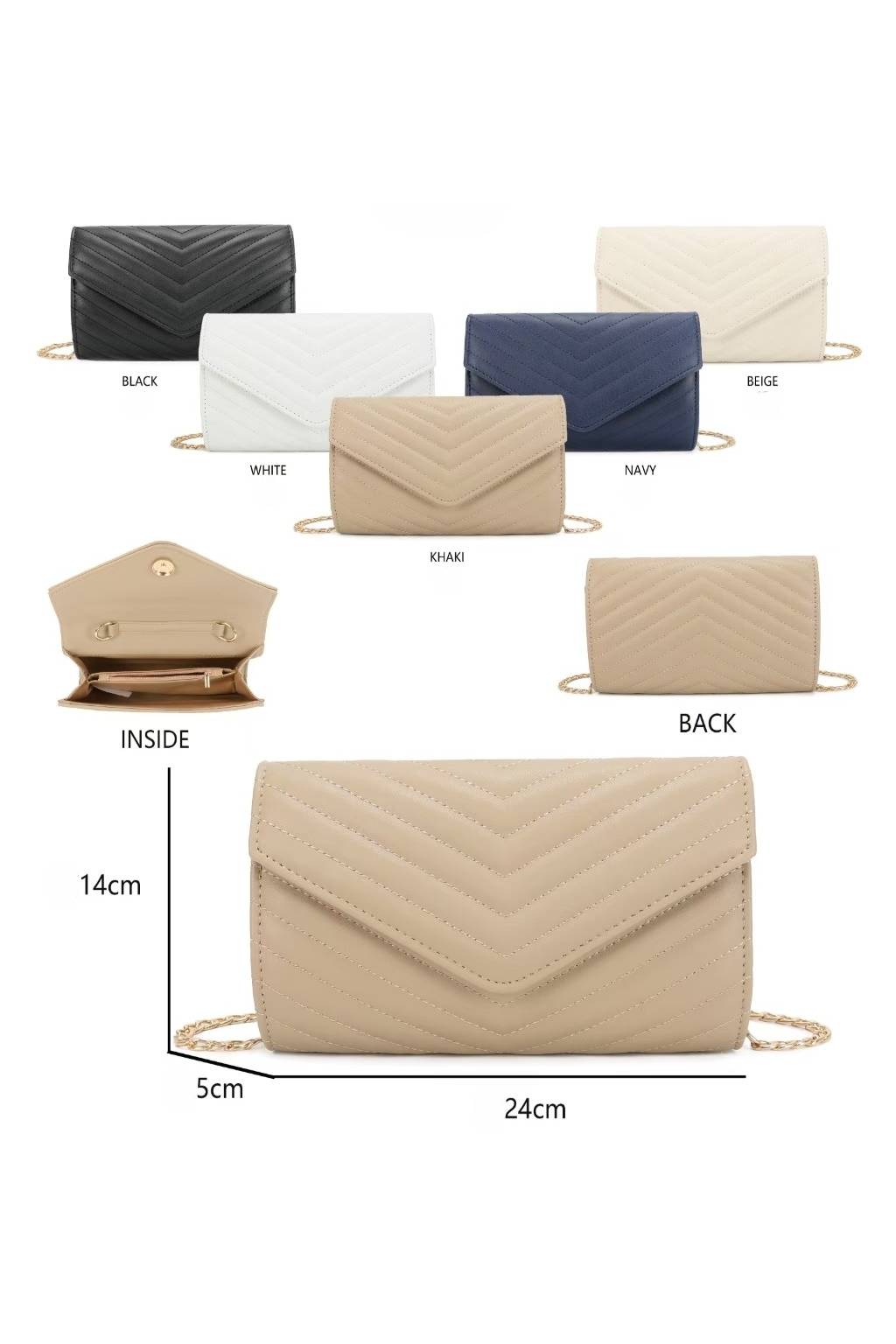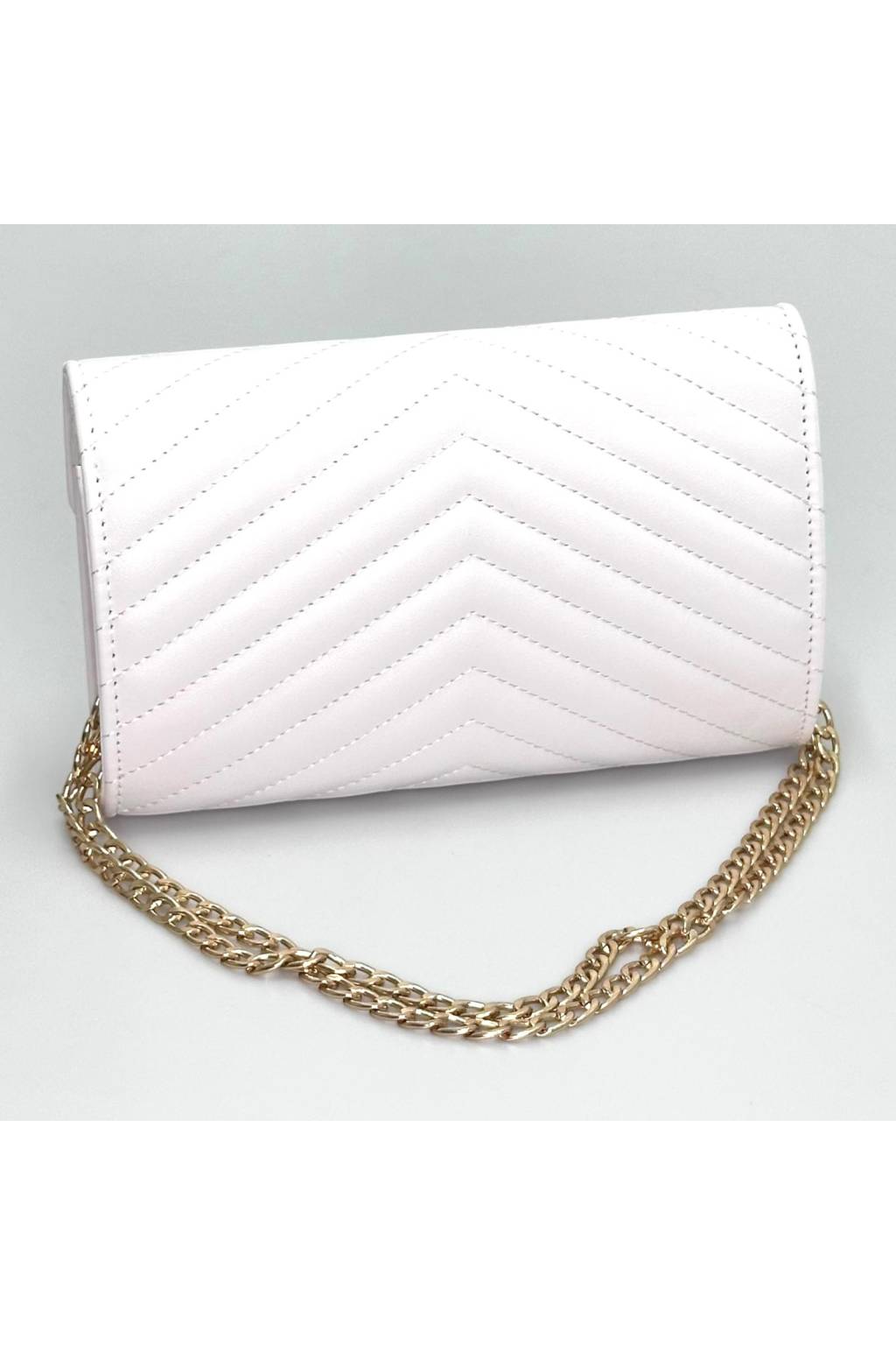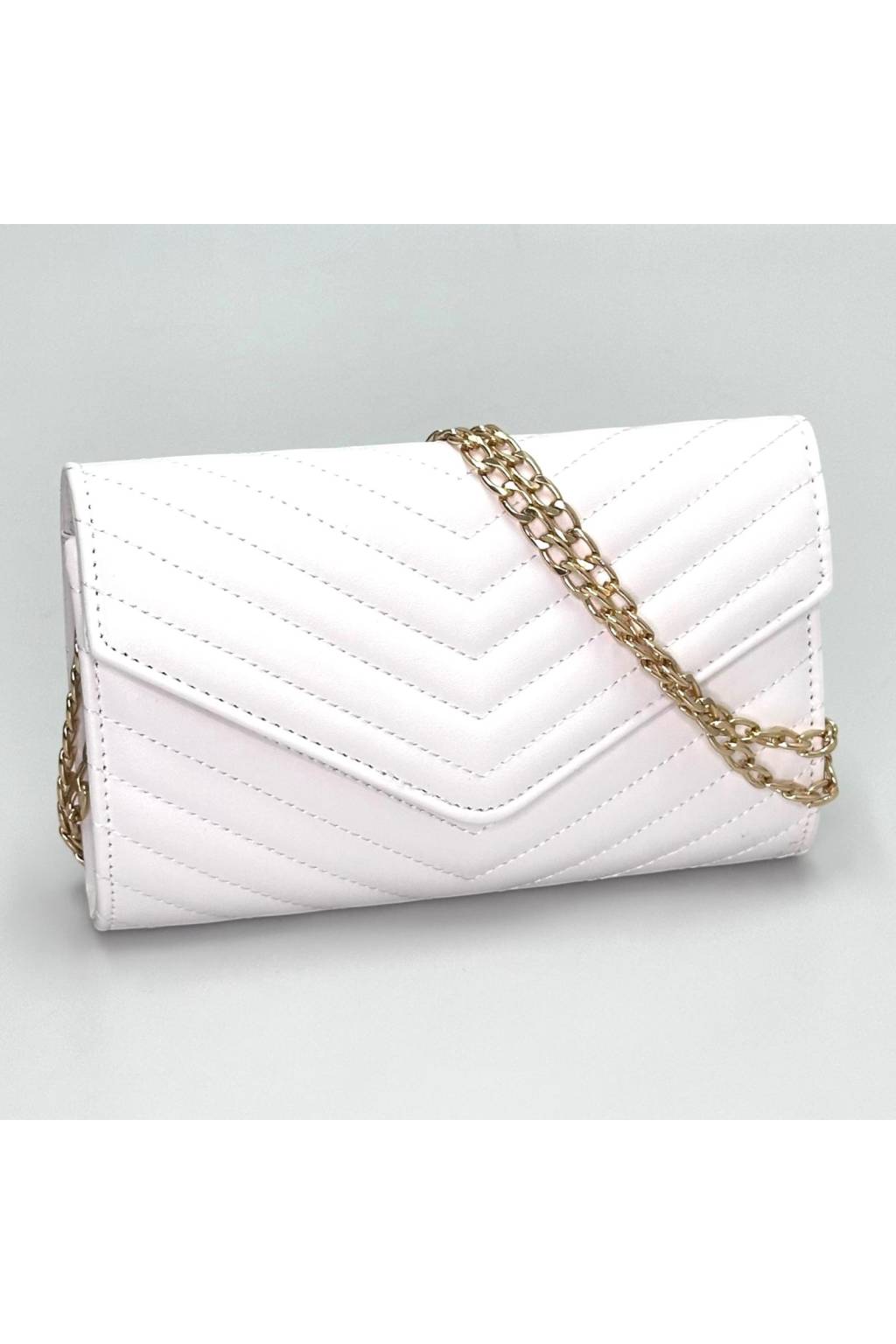 Lehoučká psaníčková/crossbody kabelka s efektním prošitím do „V“ je ideální na svatby, večírky i běžné nošení, kdy chcete mít po ruce jen to podstatné. Noste ji v ruce, na zlatém řetízku přes rameno nebo křížem.