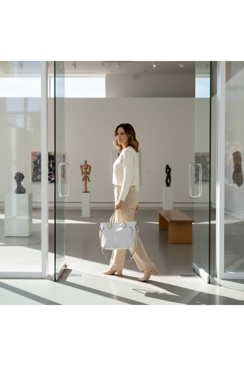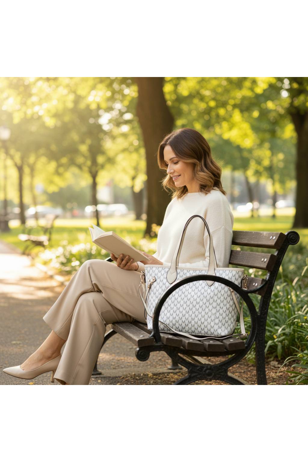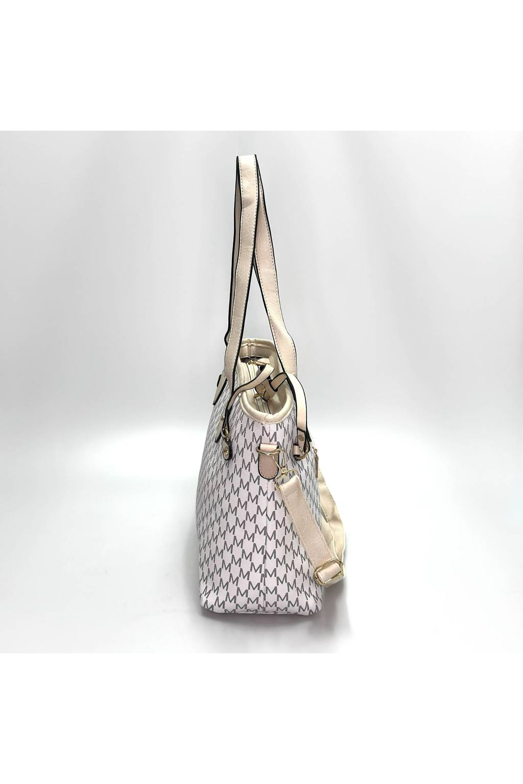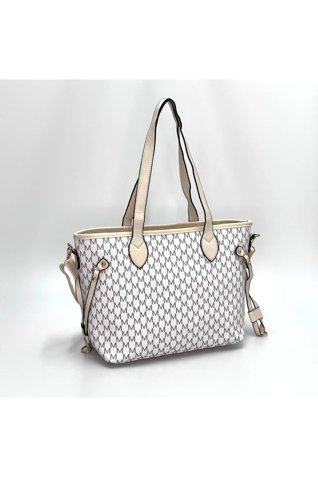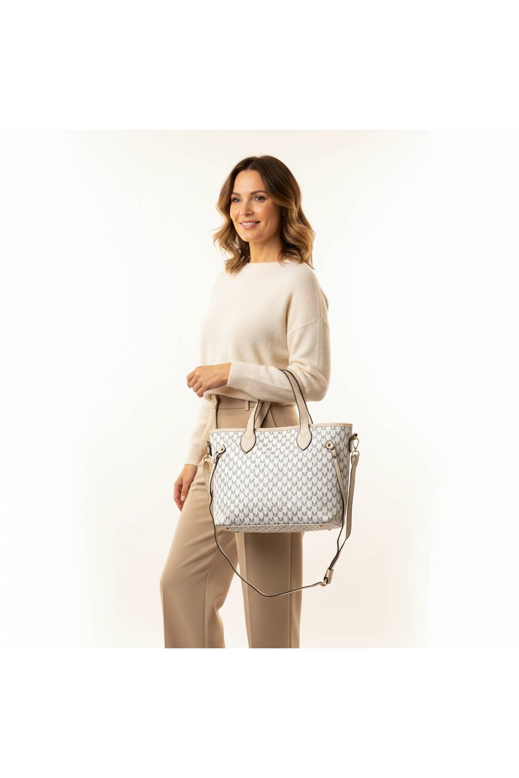 Elegantní městská shopper kabelka s jemným monogramovým vzorem a kontrastními detaily. Díky pevnému dnu, dlouhým uchům a praktickému tvaru je ideální na každý den – do práce, do města i na nákupy.