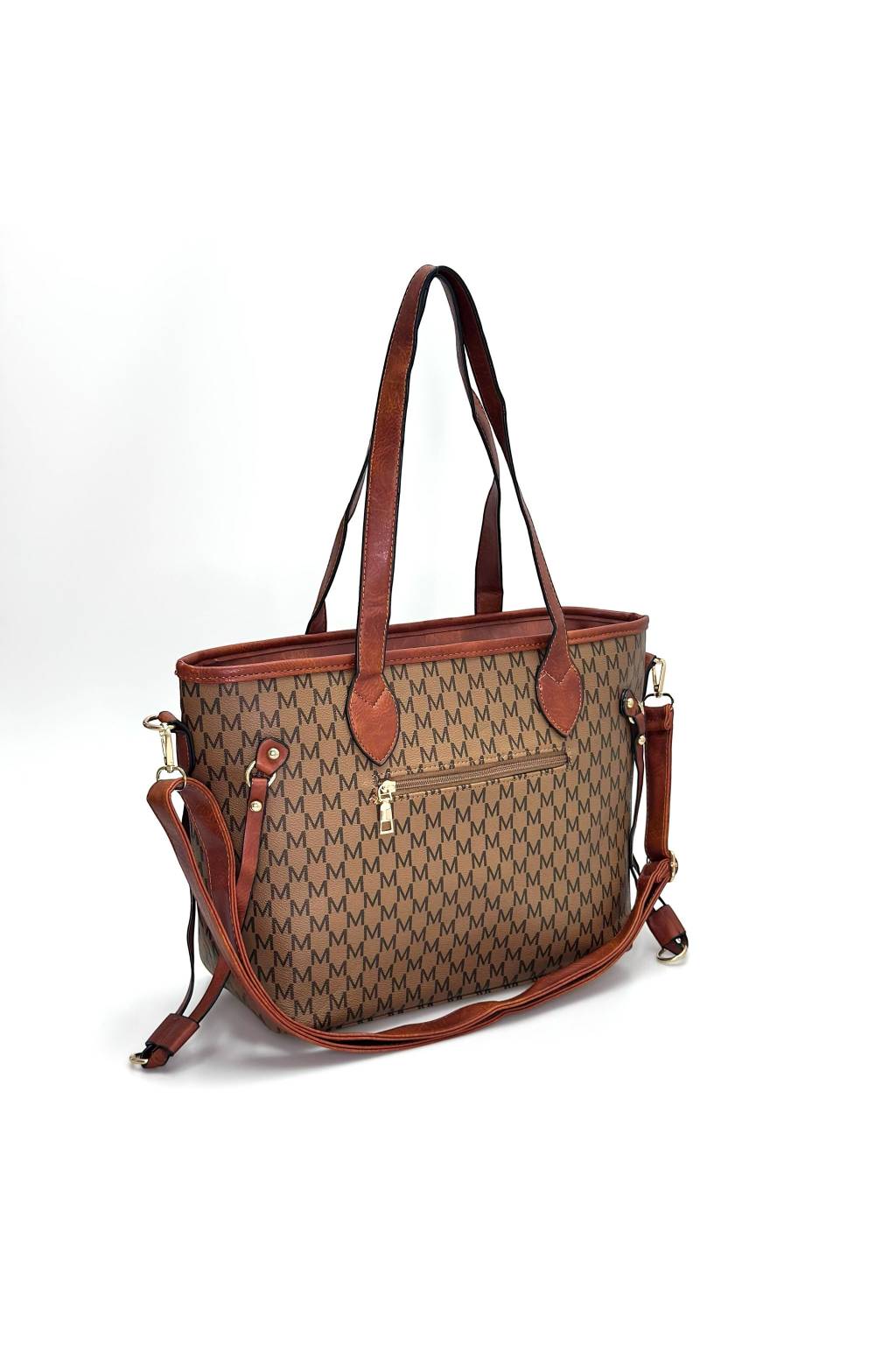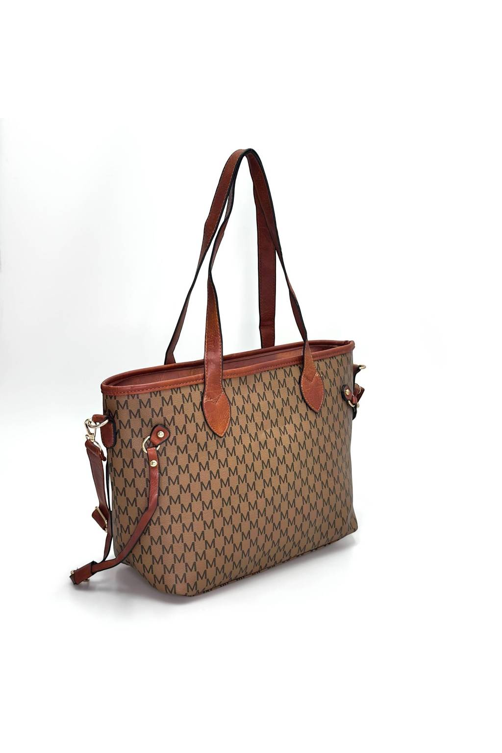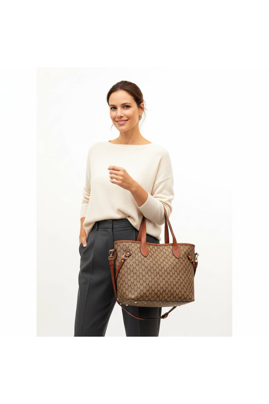 Elegantní městská shopper kabelka s jemným monogramovým vzorem a kontrastními detaily. Díky pevnému dnu, dlouhým uchům a praktickému tvaru je ideální na každý den – do práce, do města i na nákupy.