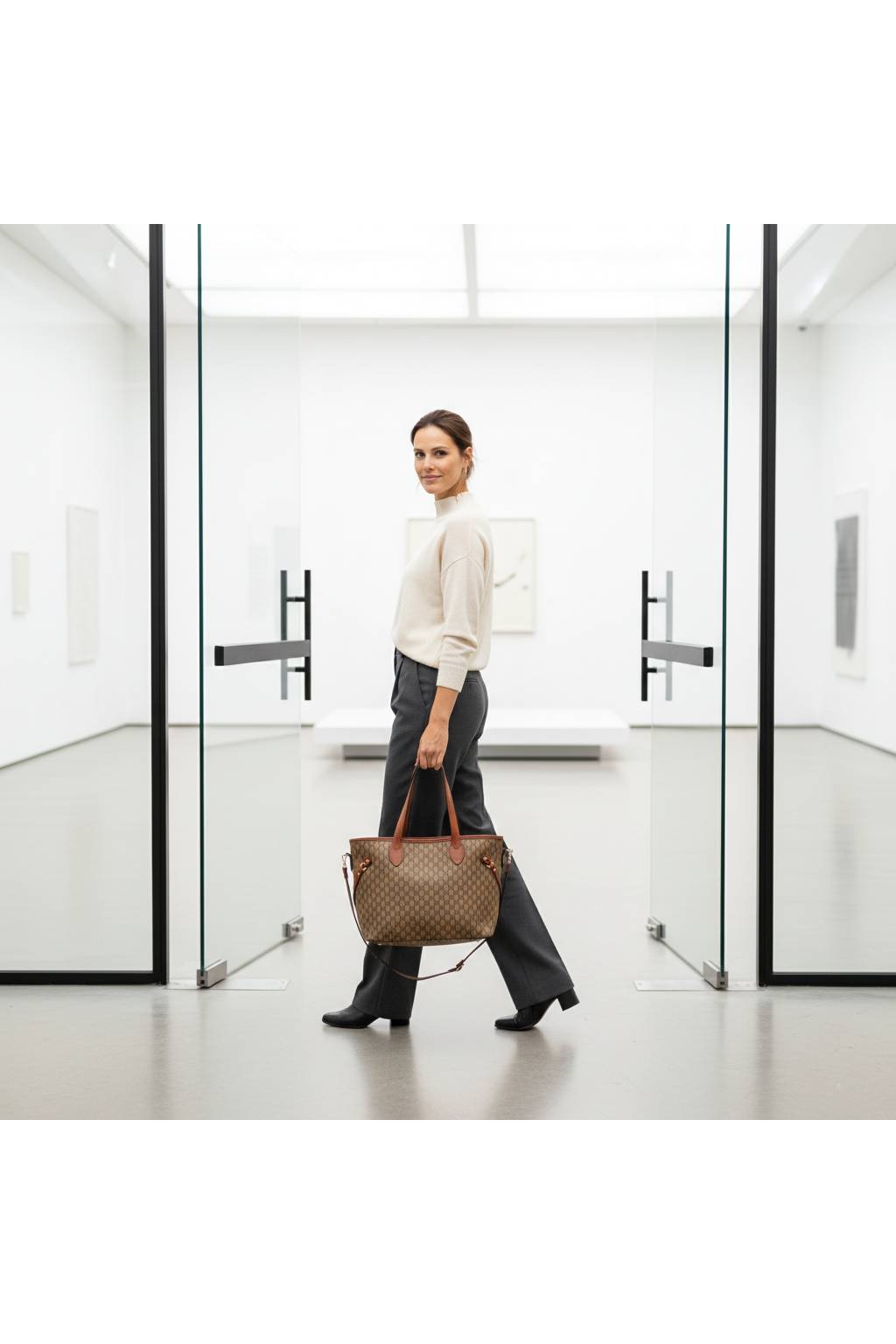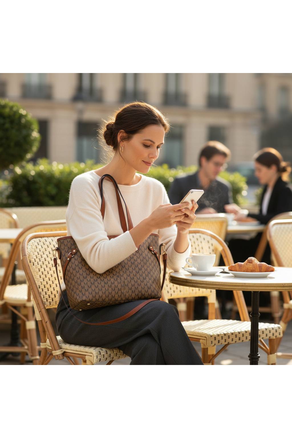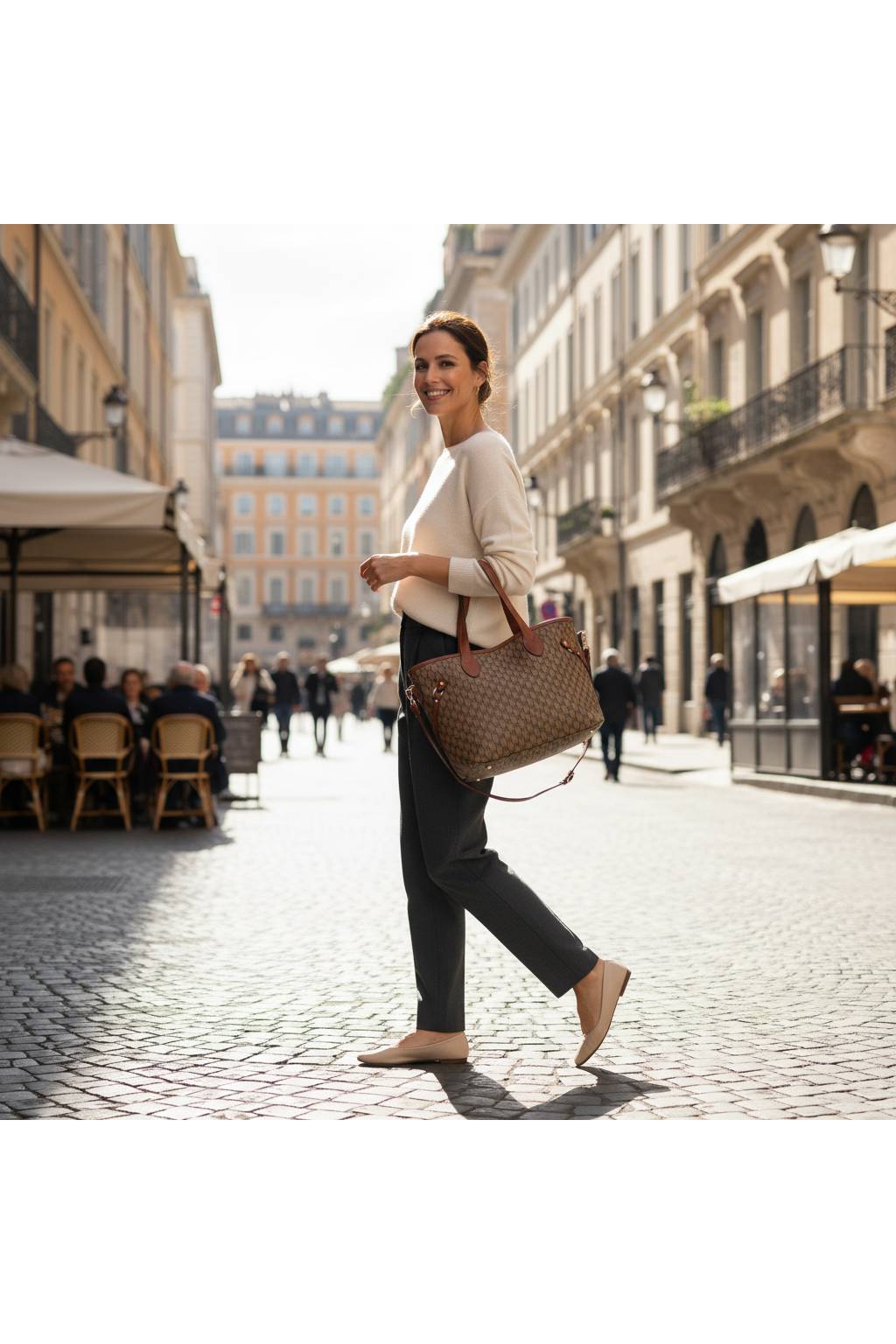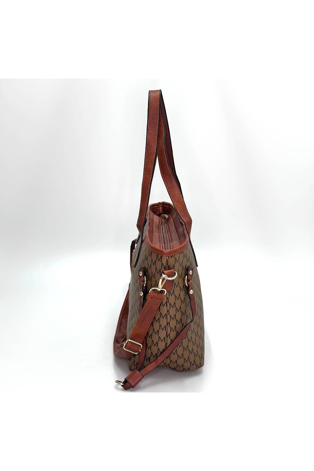 Elegantní městská shopper kabelka s jemným monogramovým vzorem a kontrastními detaily. Díky pevnému dnu, dlouhým uchům a praktickému tvaru je ideální na každý den – do práce, do města i na nákupy.