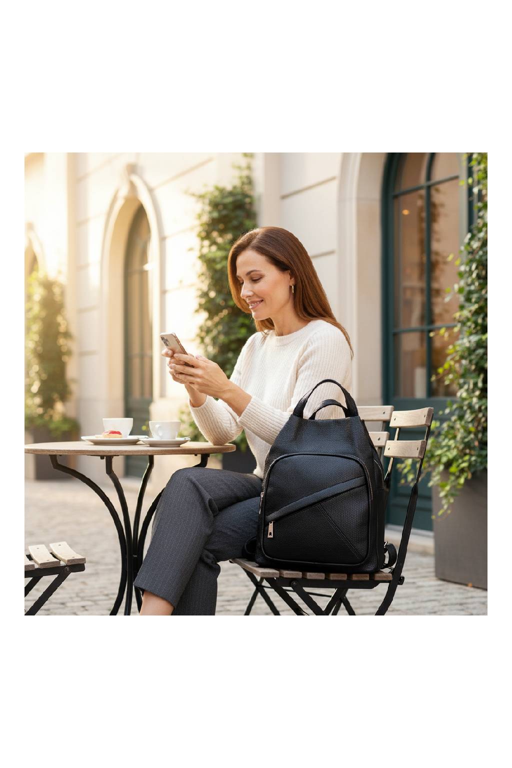 Nastavitelné popruhy umožňují pohodlné nošení na zádech, zatímco horní ucha a odnímatelný ramenní popruh nabízejí možnost rychlé přeměny na kabelku. Kvalitní syntetický materiál s jemnou strukturou působí elegantně a zároveň je odolný vůči každodennímu používání.