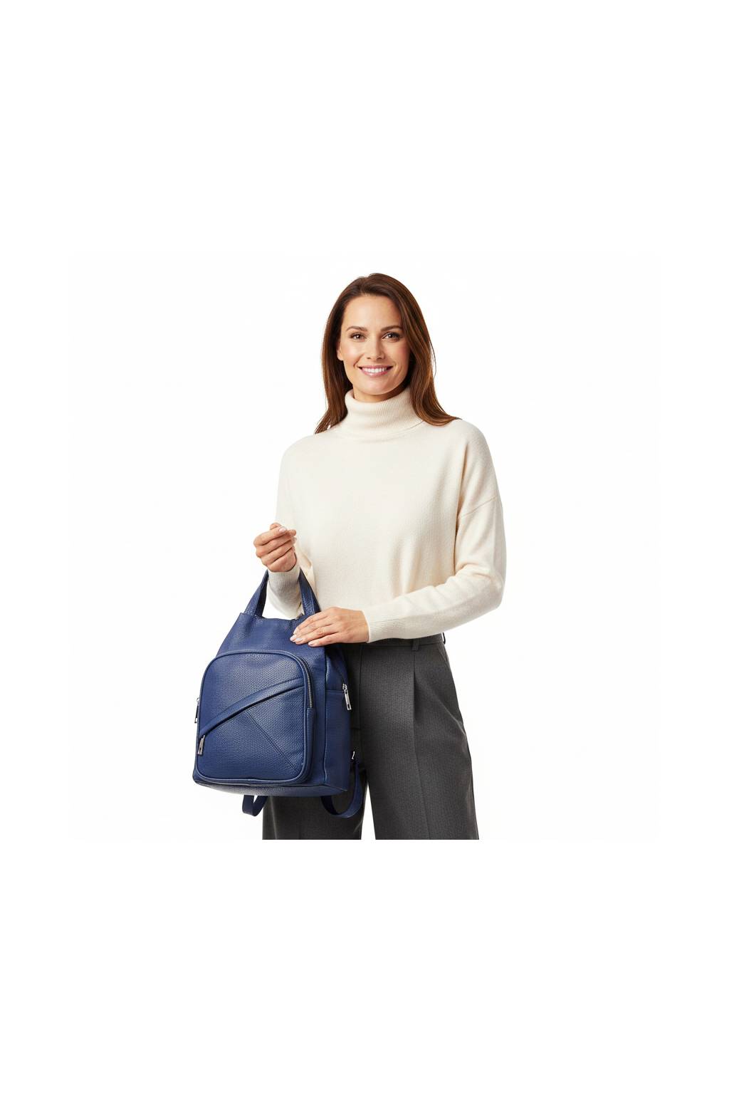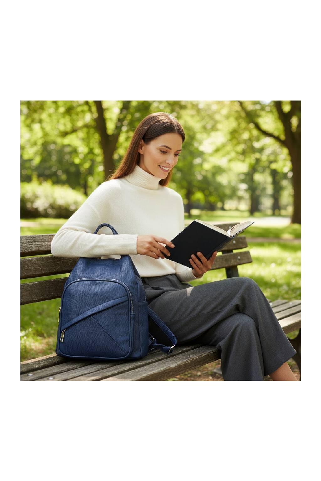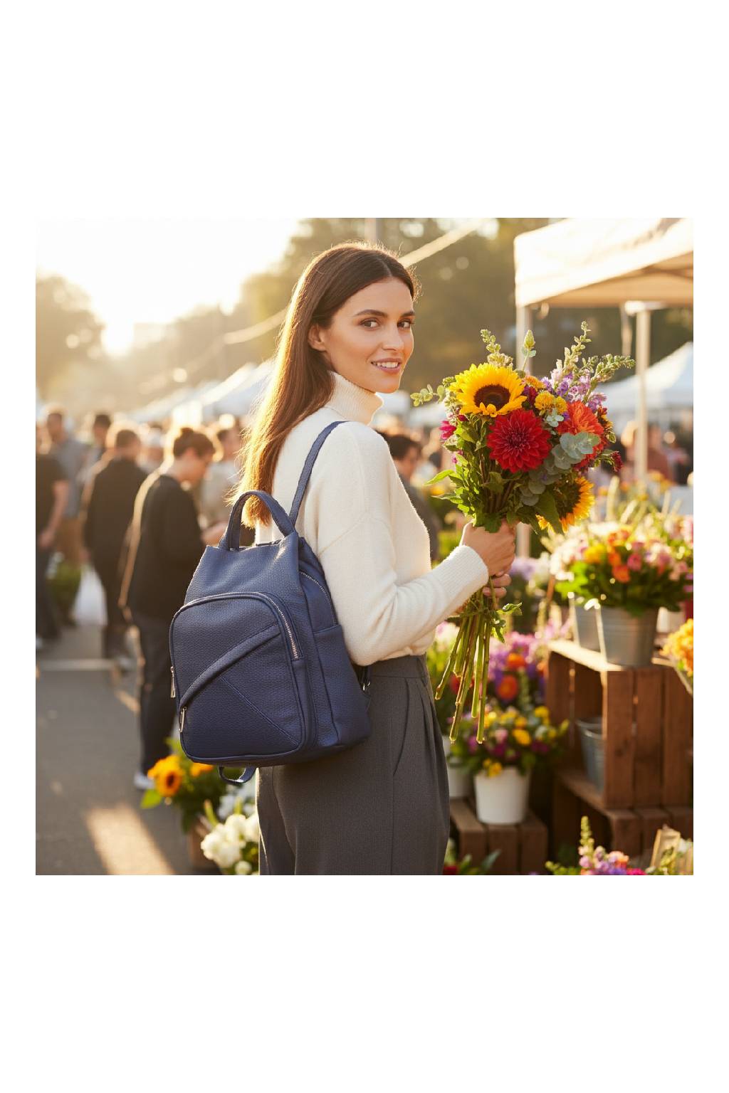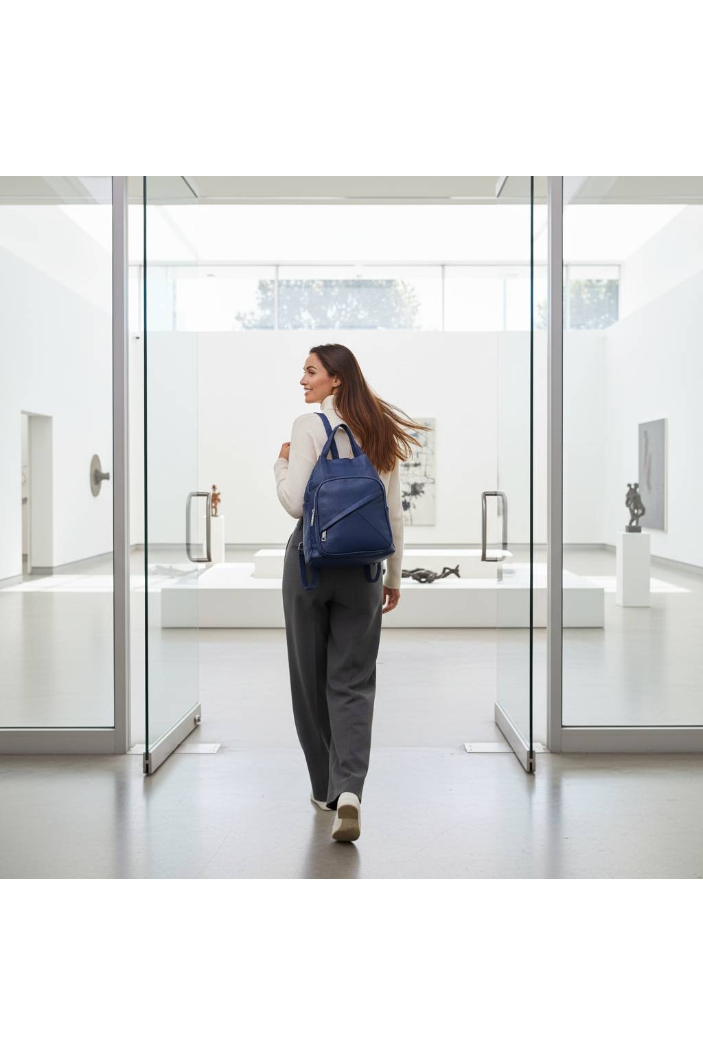 Nastavitelné popruhy umožňují pohodlné nošení na zádech, zatímco horní ucha a odnímatelný ramenní popruh nabízejí možnost rychlé přeměny na kabelku. Kvalitní syntetický materiál s jemnou strukturou působí elegantně a zároveň je odolný vůči každodennímu používání.
