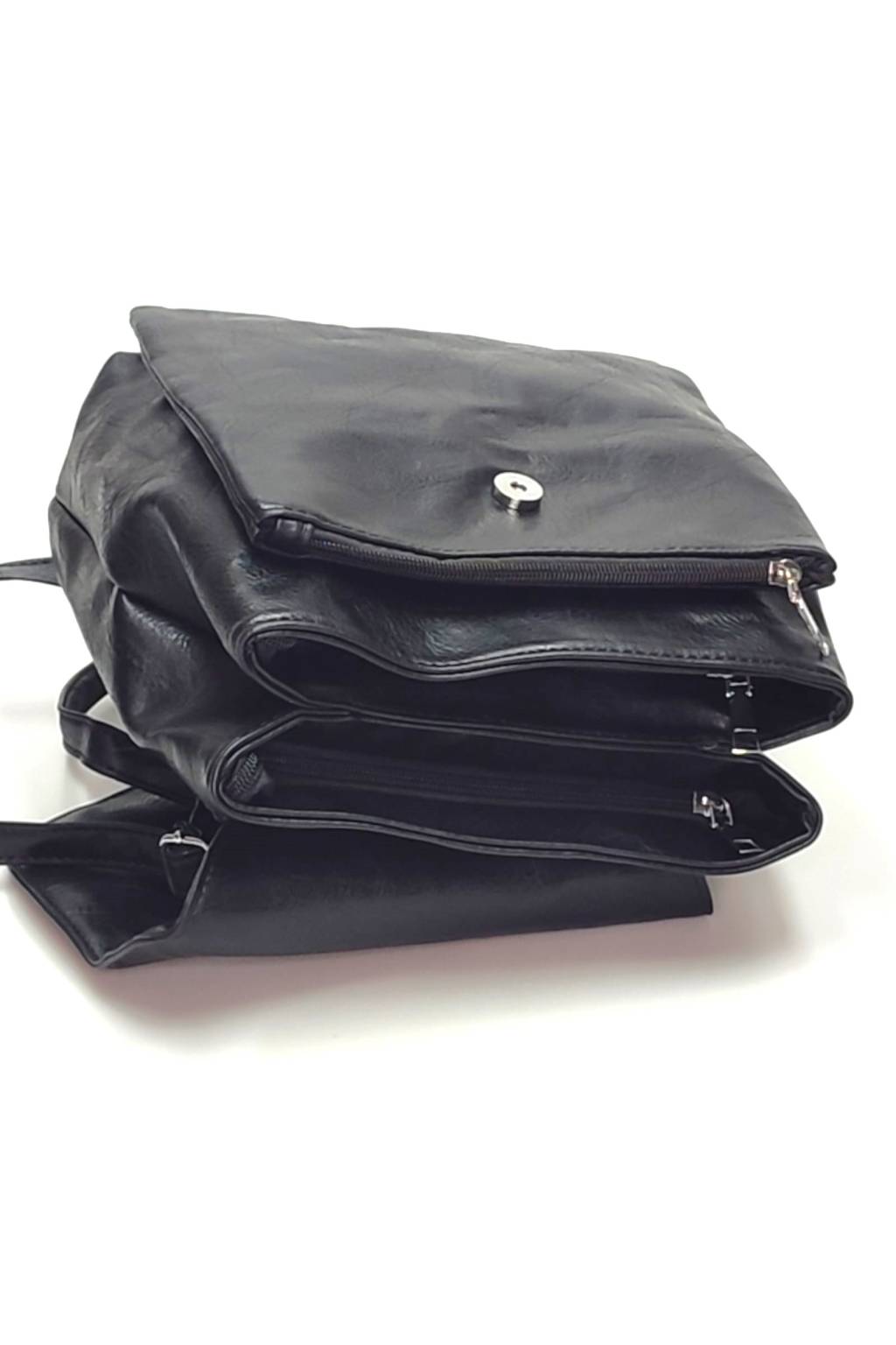 Klopa batohu se uzavírá , pod ní jsou 2 přihrádky uzavíratelné zipem.