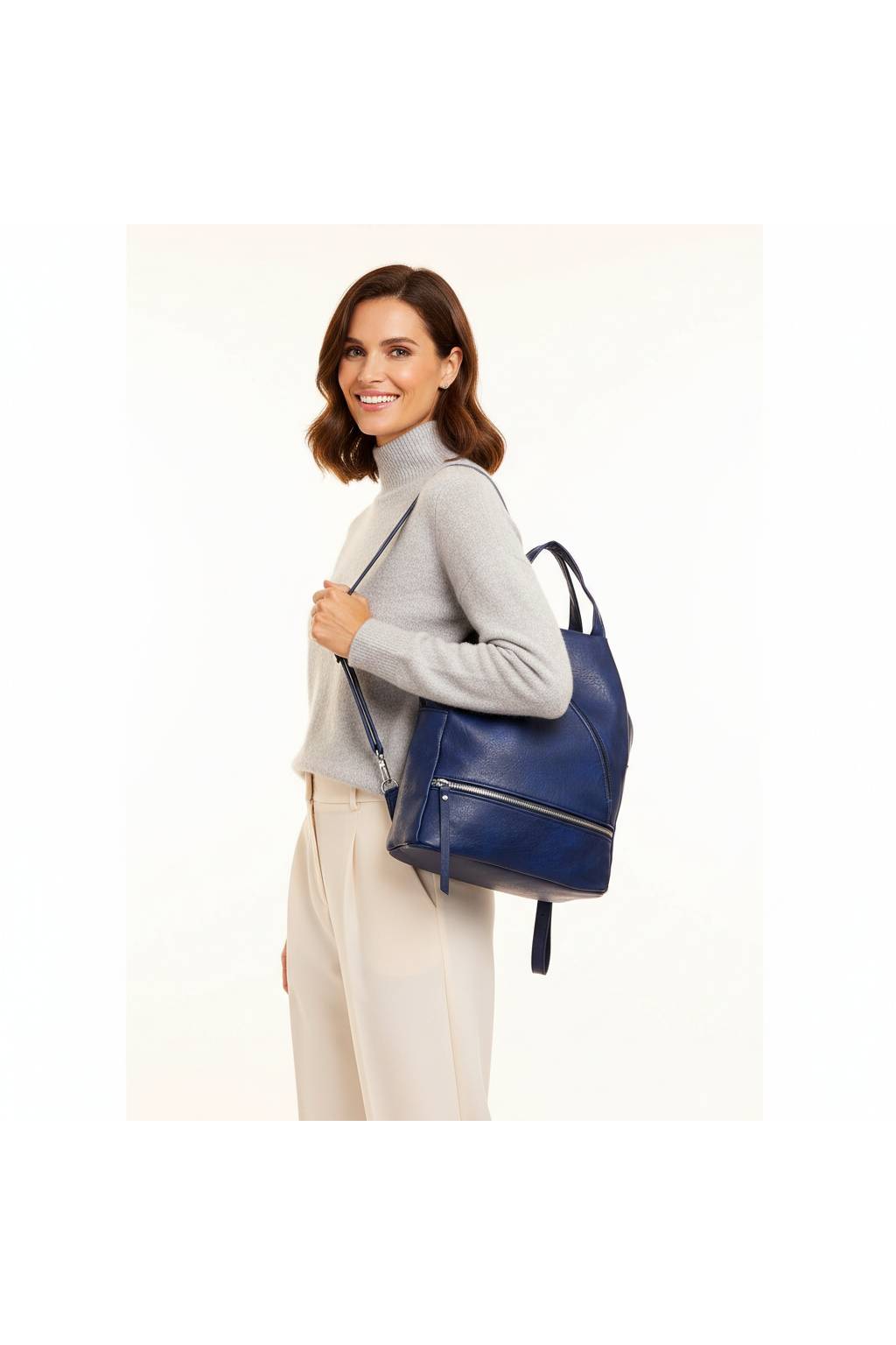Lehký městský batoh, který díky chytrým popruhům snadno proměníte i v kabelku přes rameno. Minimalistický vzhled s výrazným šikmým zipem a spodní kapsou ladí k džínům i šatům.