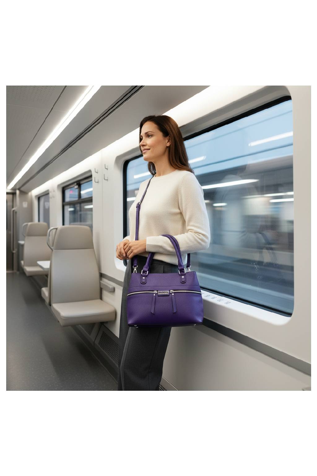 Hlavní komora se zapíná na zip – uvnitř je zipová kapsa na drobnosti a otevřené přihrádky na mobil či klíče. Na přední straně najdete širokou zipovou kapsu s dekorativními poutky, vzadu další bezpečnou kapsu na zip. Zpevněné dno drží tvar a udrží pořádek.