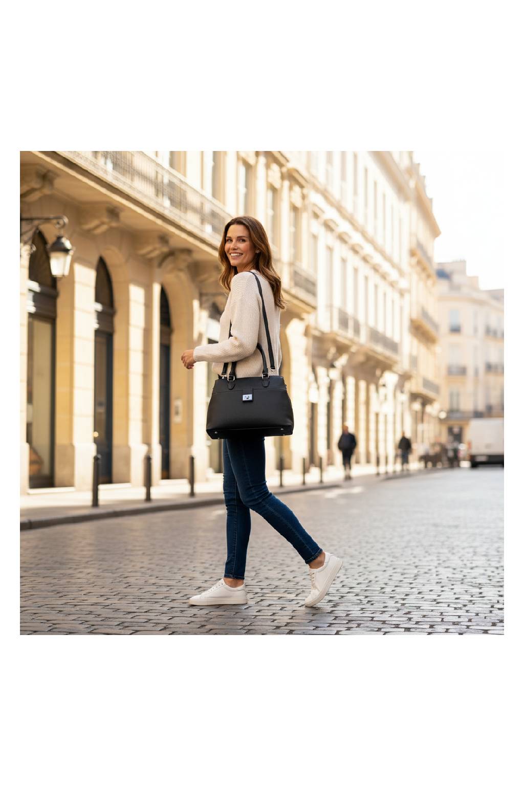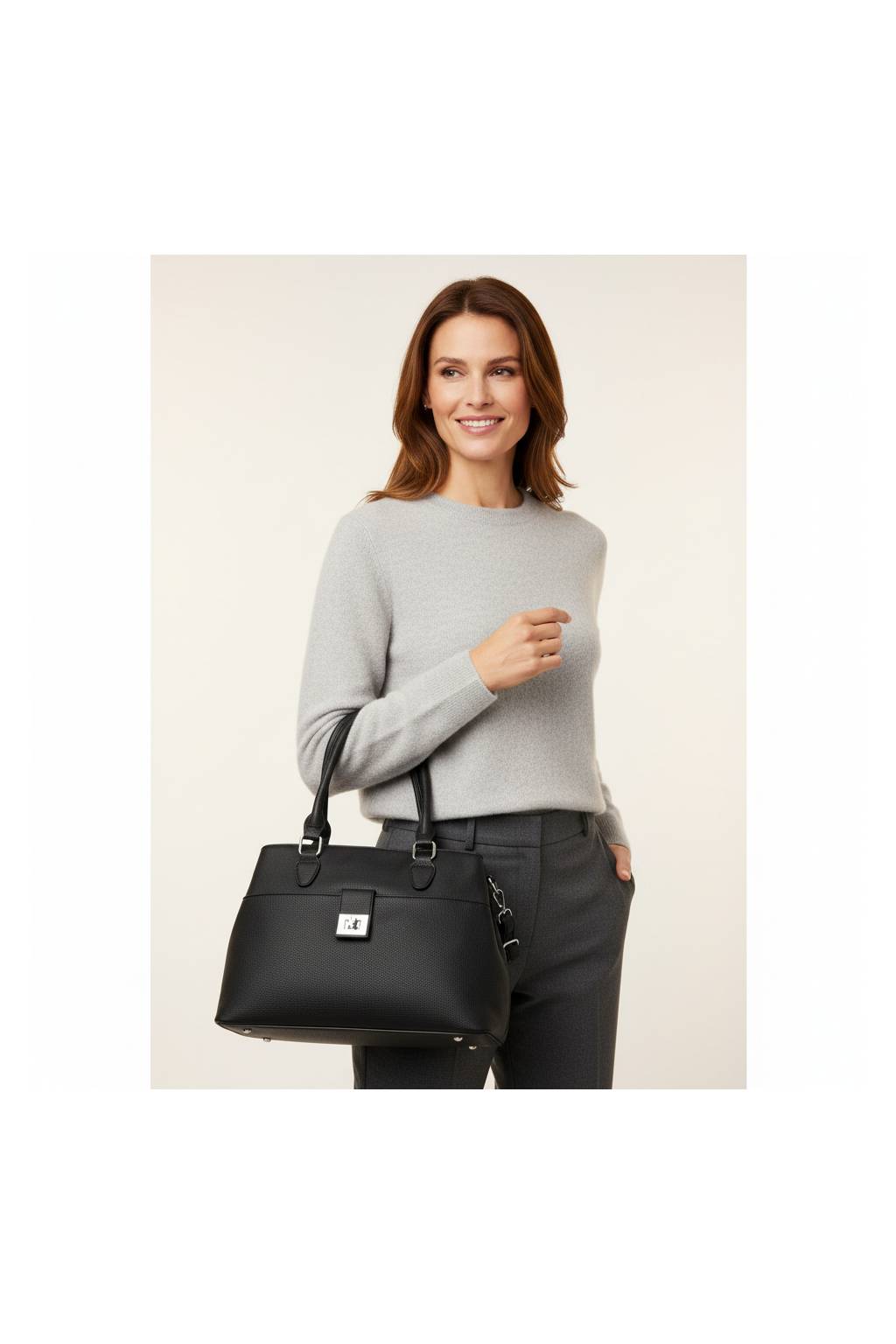 Elegantní každodenní kabelka v univerzálni  barvě, která spojuje čistý design, praktické členění a pohodlné nošení v ruce i na rameni. Nadčasový tvar, jemná struktura materiálu a kovové detaily z ní dělají univerzální kousek do práce, do města i na volný čas.