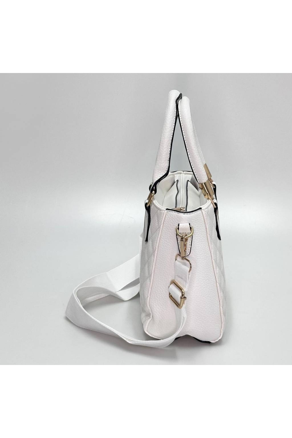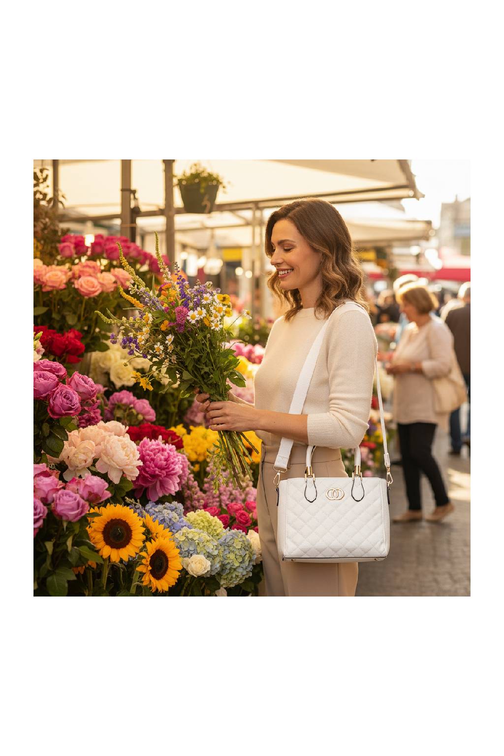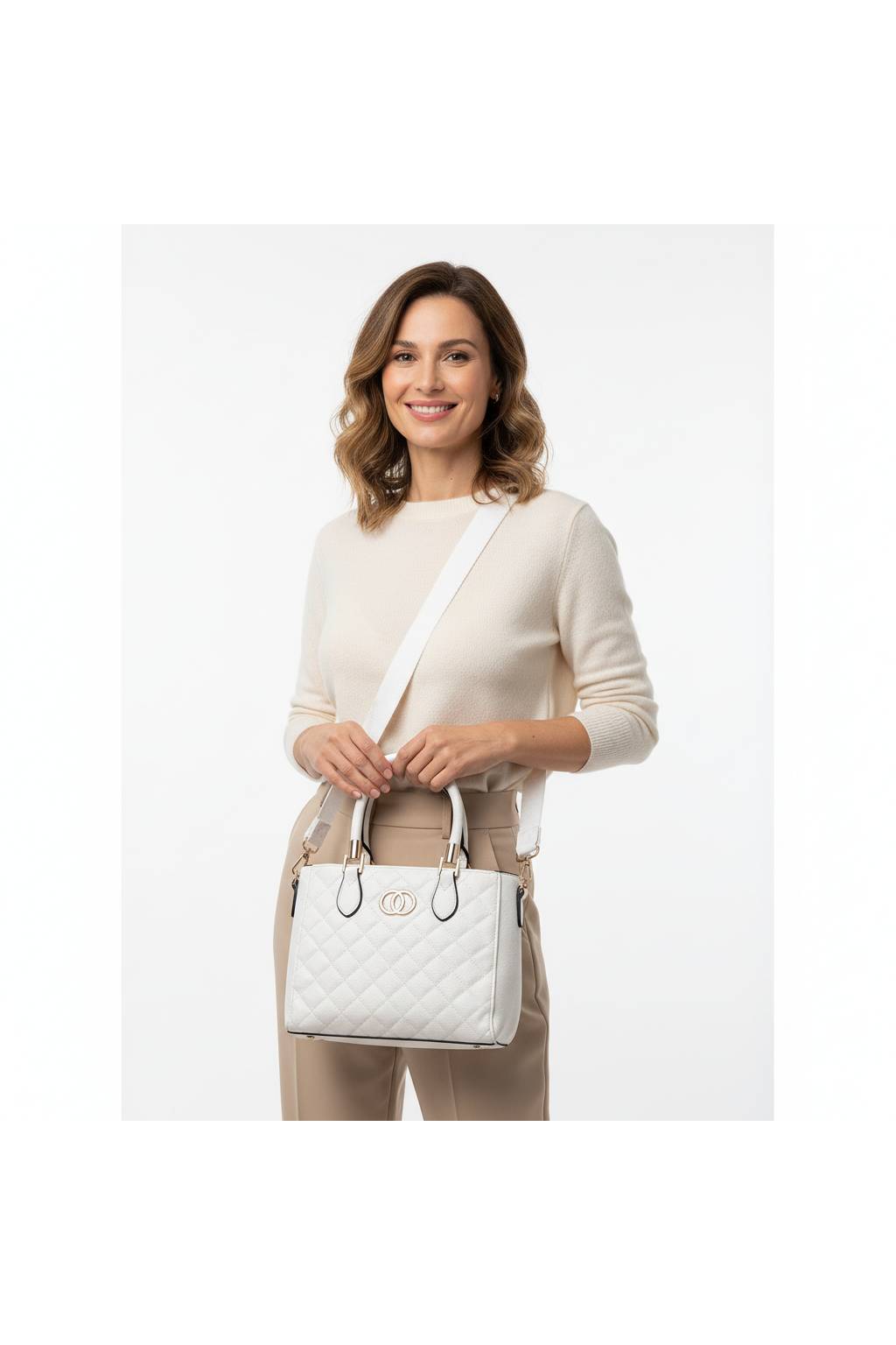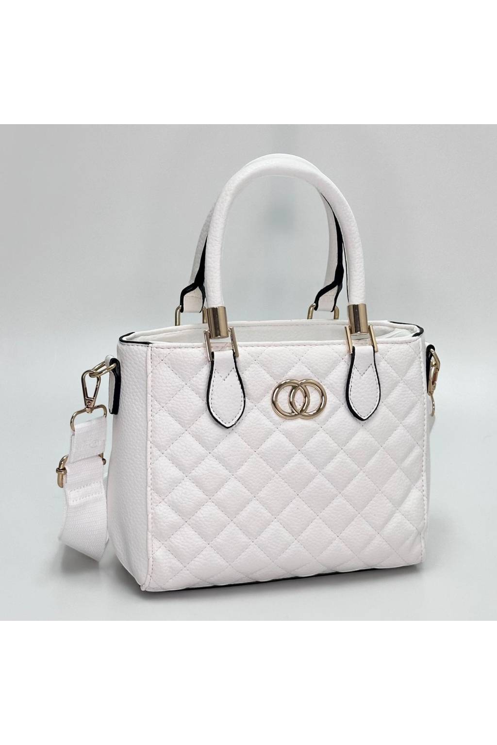 Šik, lehká a maximálně univerzální. Tato kompaktní kabelka s kosočtvercovým prošíváním a zlatým kováním kombinuje pevná kratší ucha s odepínacím nastavitelným popruhem na nošení crossbody. Skvělá do města, do práce i k elegantnímu outfitu.