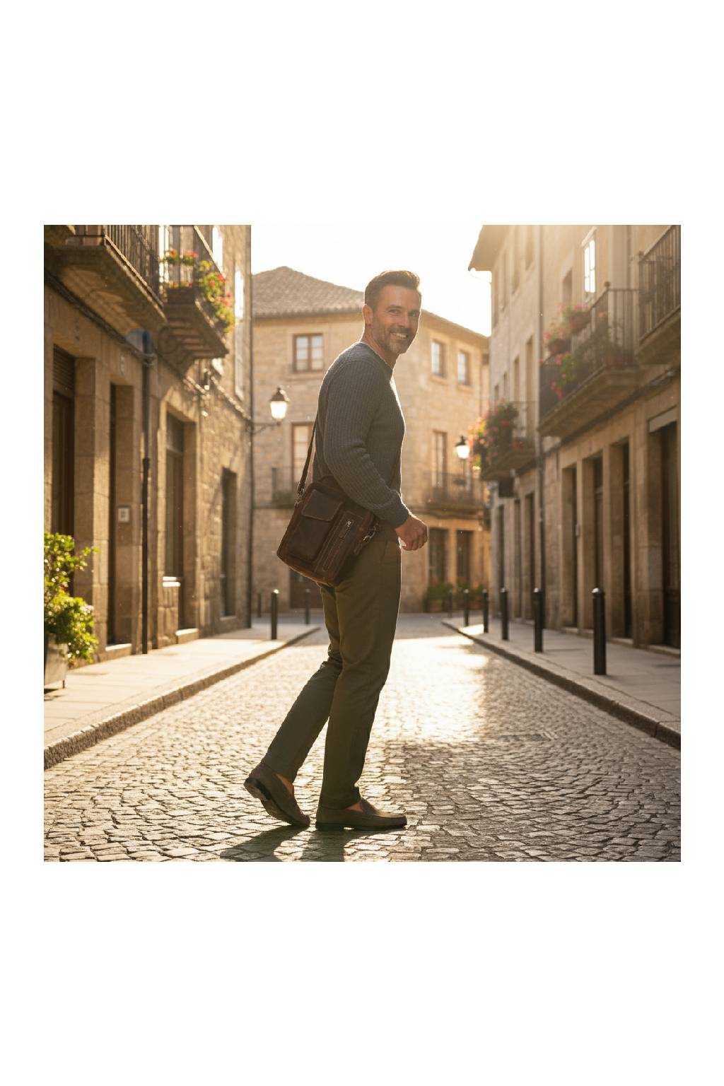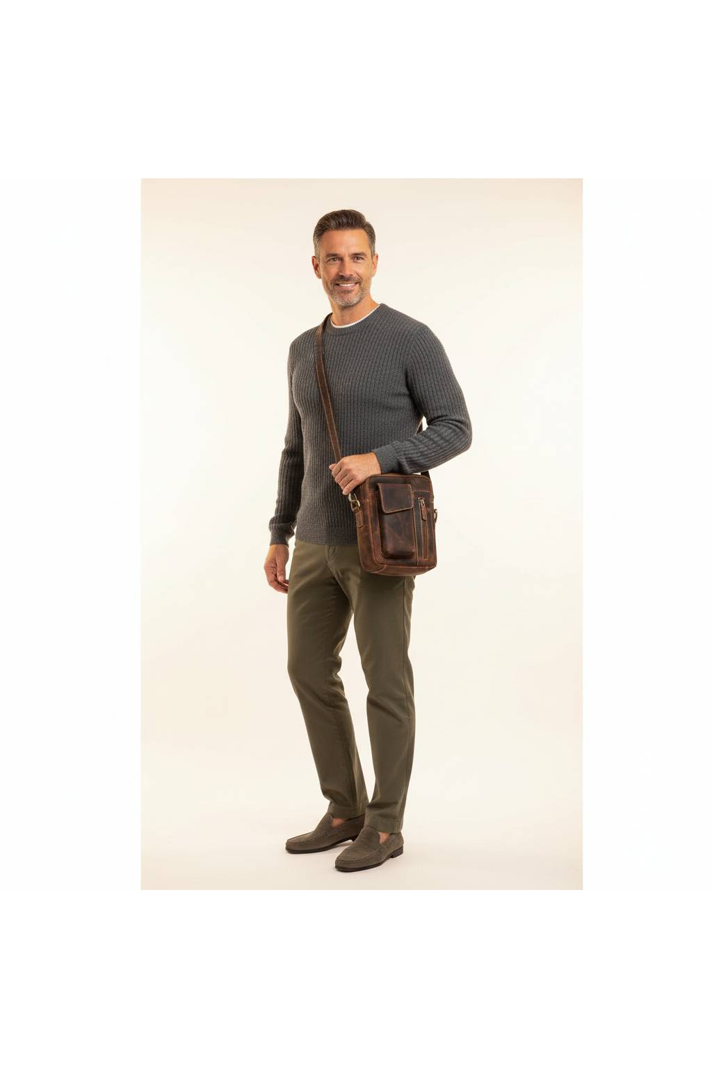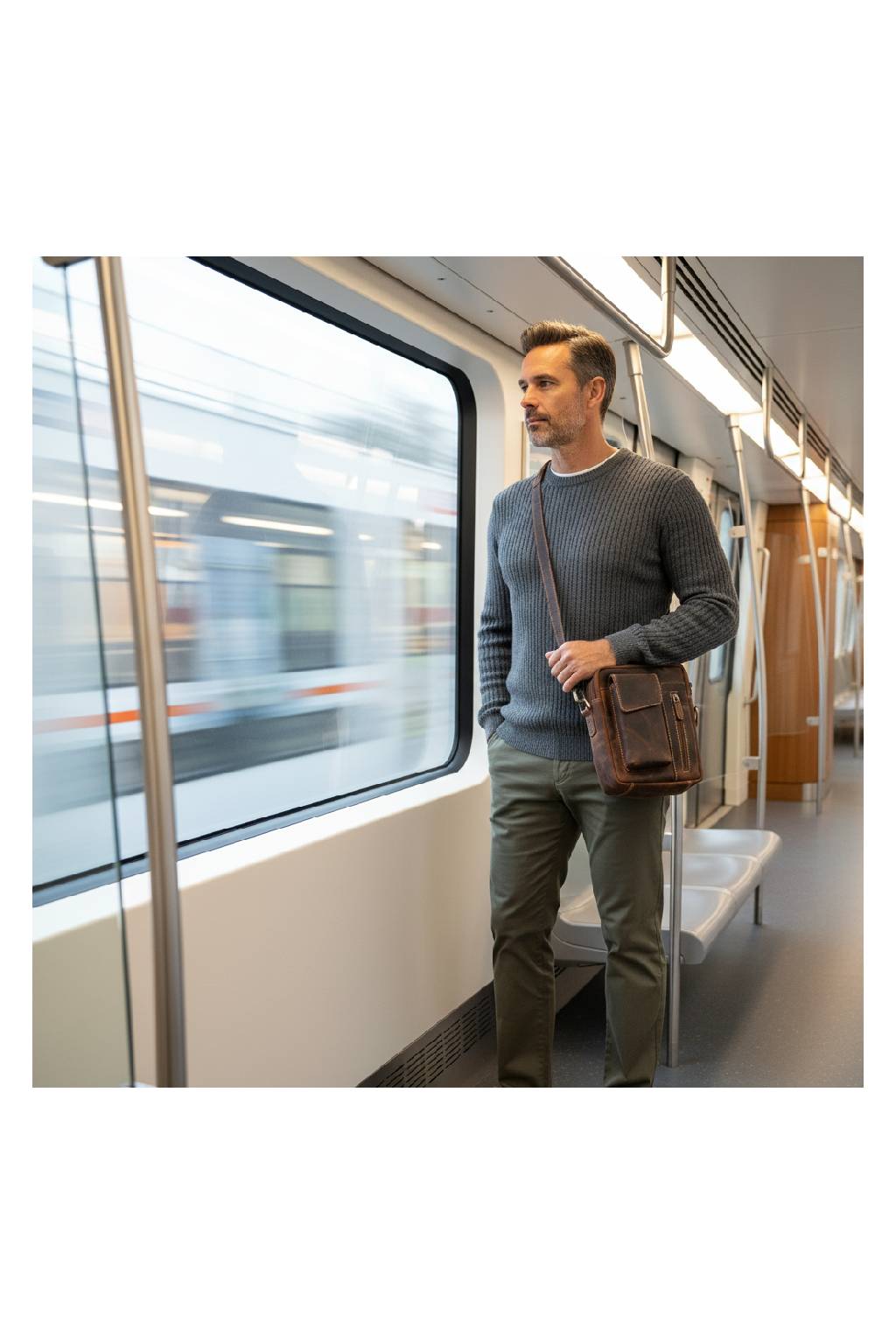 Stylová pánská crossbody taška v retro „crazy horse“ vzhledu. Ideální do práce, do města i na cesty. Přehledně členěné kapsy udrží telefon, peněženku, klíče, doklady i menší tablet (~10") v bezpečí. Širší nastavitelný popruh s koženým páskem se nosí pohodlně celý den.