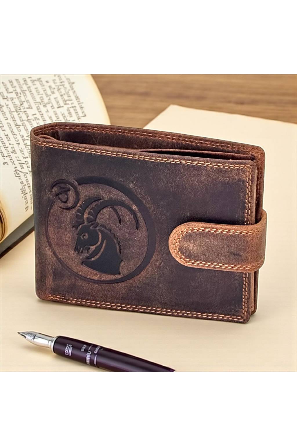 Stylová pánská peněženka z pravé hovězí kůže v rustikálním hnědém provedení s ražbou znamení Kozoroh. Zavírání na pevný druk, dvě přihrádky na bankovky, kapsa na mince na druk, zipová kapsa, průhledné okénko na doklady a více kapes na karty. Odolné šití, nadčasový vzhled, ideální dárek pro muže narozené ve znamení Kozoroha.
