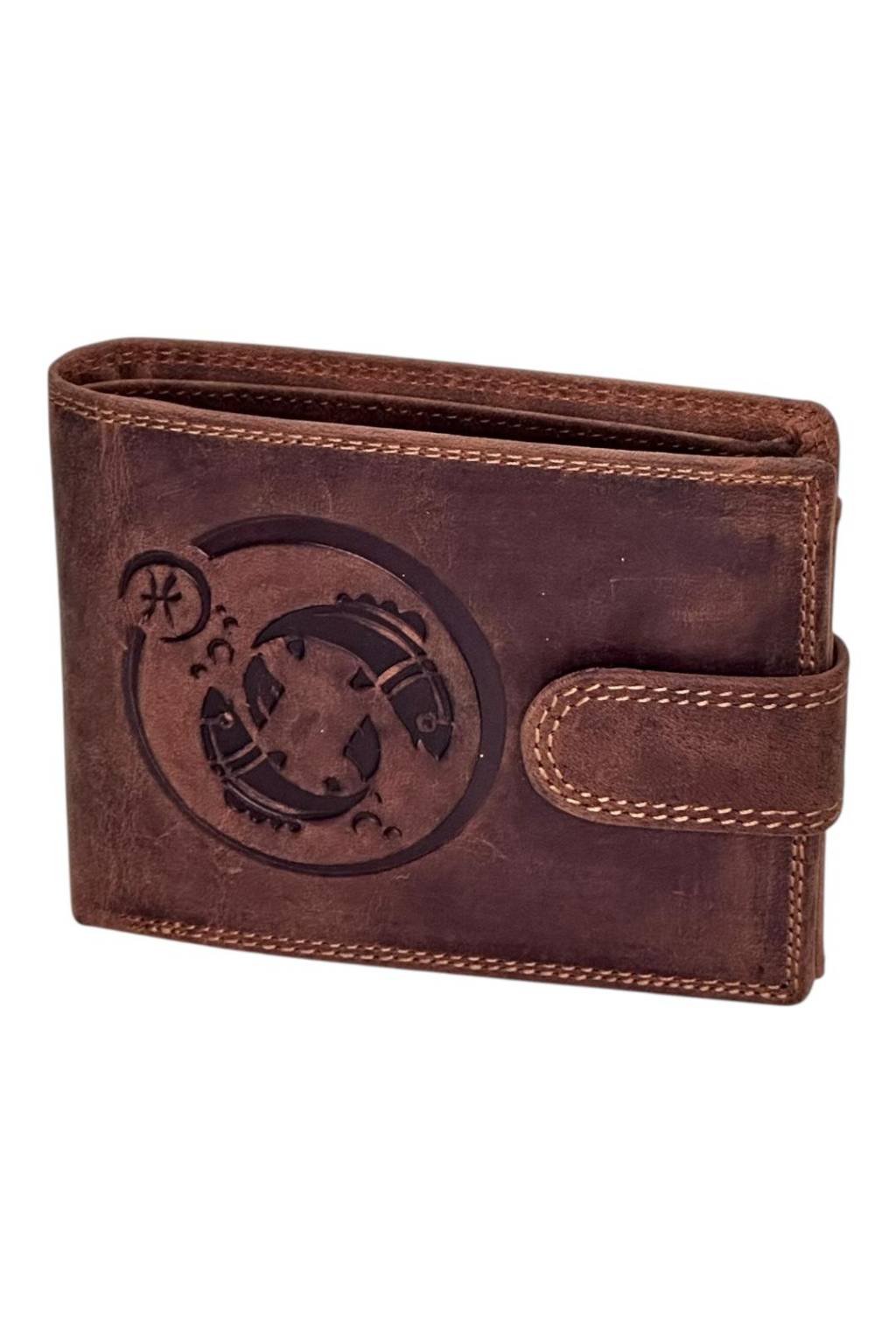 Elegantní pánská peněženka z pravé kůže s plastickým motivem znamení zvěrokruhu Ryby. Nadčasový „crazy horse“ vzhled, poctivé šití a promyšlená vnitřní organizace z ní dělají perfektní doplněk pro každý den i jistotu skvělého dárku.