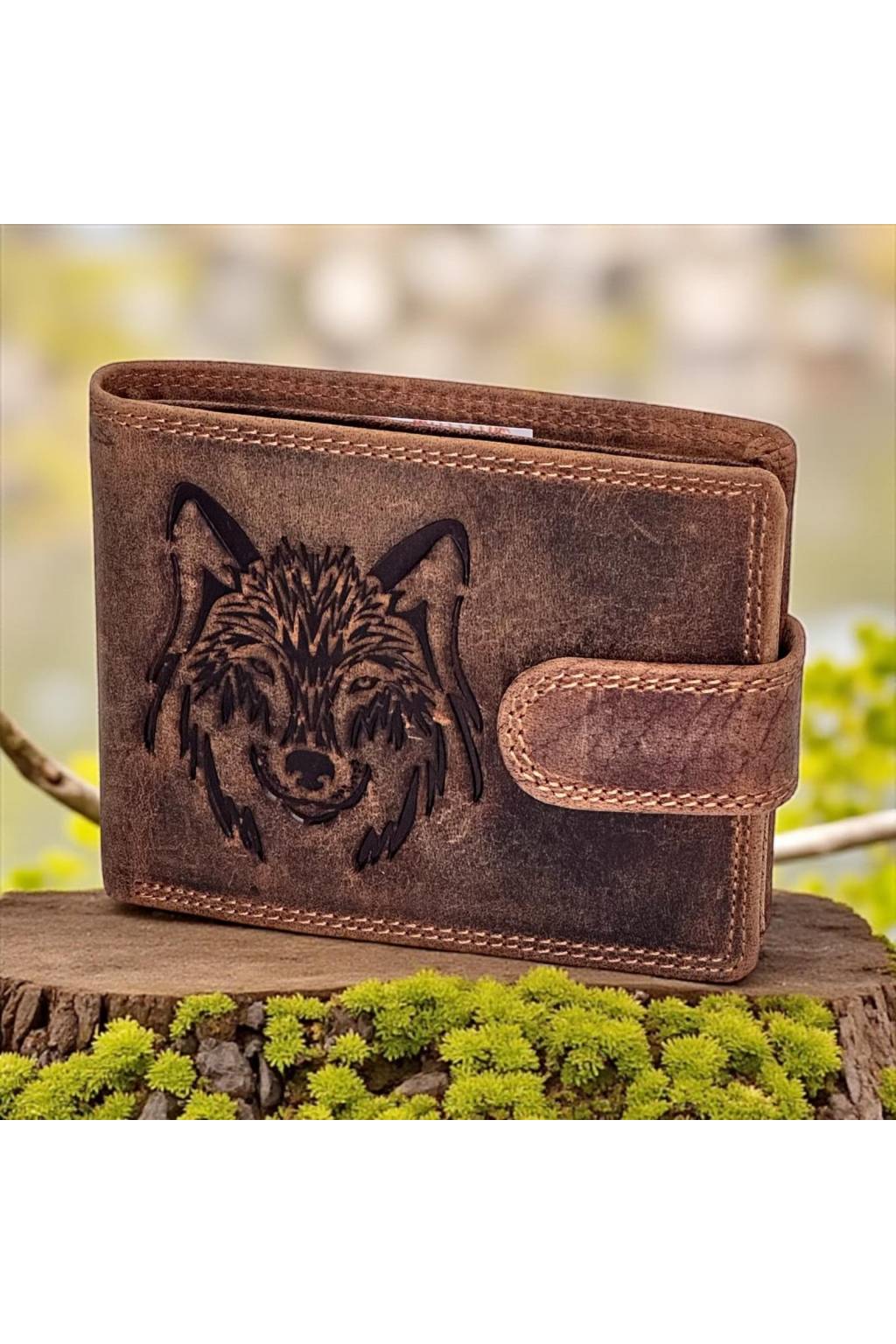 Stylová pánská peněženka z poctivé hovězí kůže s výraznou reliéfní razbou vlčí hlavy. Praktické členění: mnoho kapes na karty, kapsa na mince na druk, průhledné okénko na doklad a zipová přihrádka. Nadčasový „old leather“ vzhled, pevné švy a bezpečné zapínání na pásek s drukem.