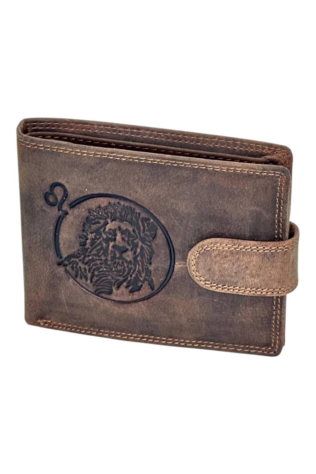 Stylová pánská peněženka z odolné pravé hovězí kůže v úpravě Crazy Horse spojuje robustnost, promyšlený vnitřek a výrazný reliéf znamení zvěrokruhu – Lev. Patinovaná hnědá kůže časem krásně zraje; jemné škrábance lze snadno rozleštit a peněženka získává jedinečný charakter.